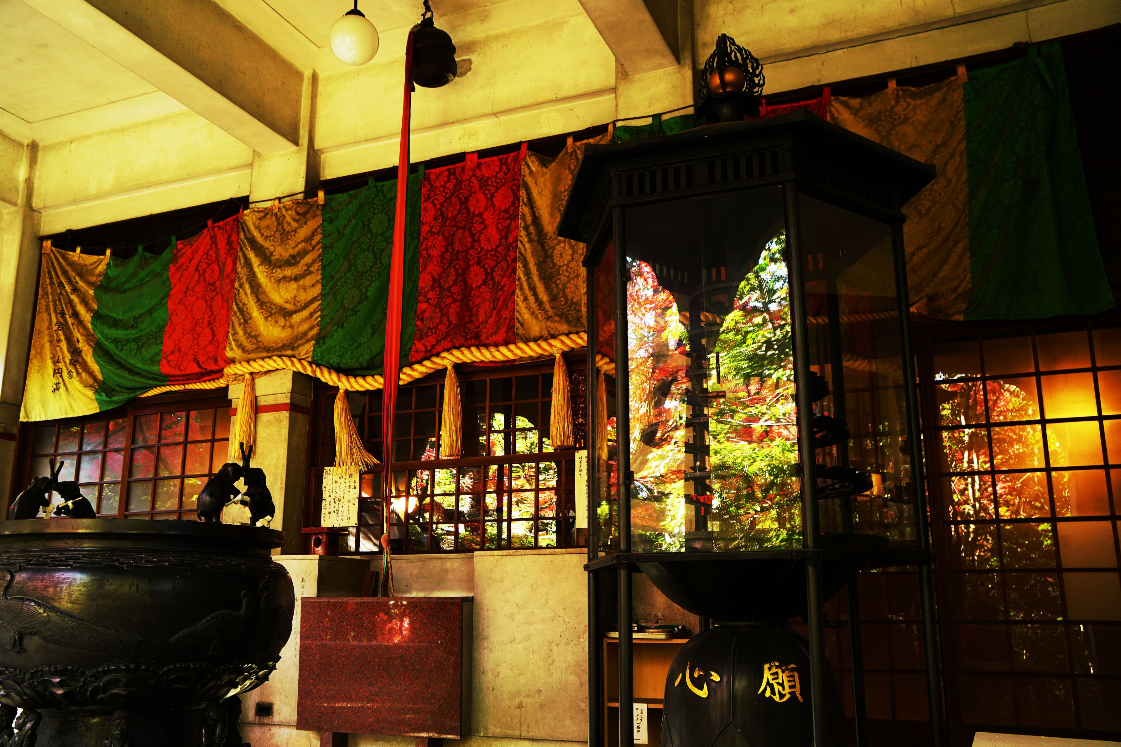 前回投稿のお寺の本堂です。 五色幕・注連縄・本坪鈴・鈴緒・賽銭箱・献灯台?・そして象さん!!色々と揃っていました。どんな宗教でしょう。 今年の秋模様は 此処のガラス面に「写り込んだ錦の色合い」 令和の秋は 映り込みです。