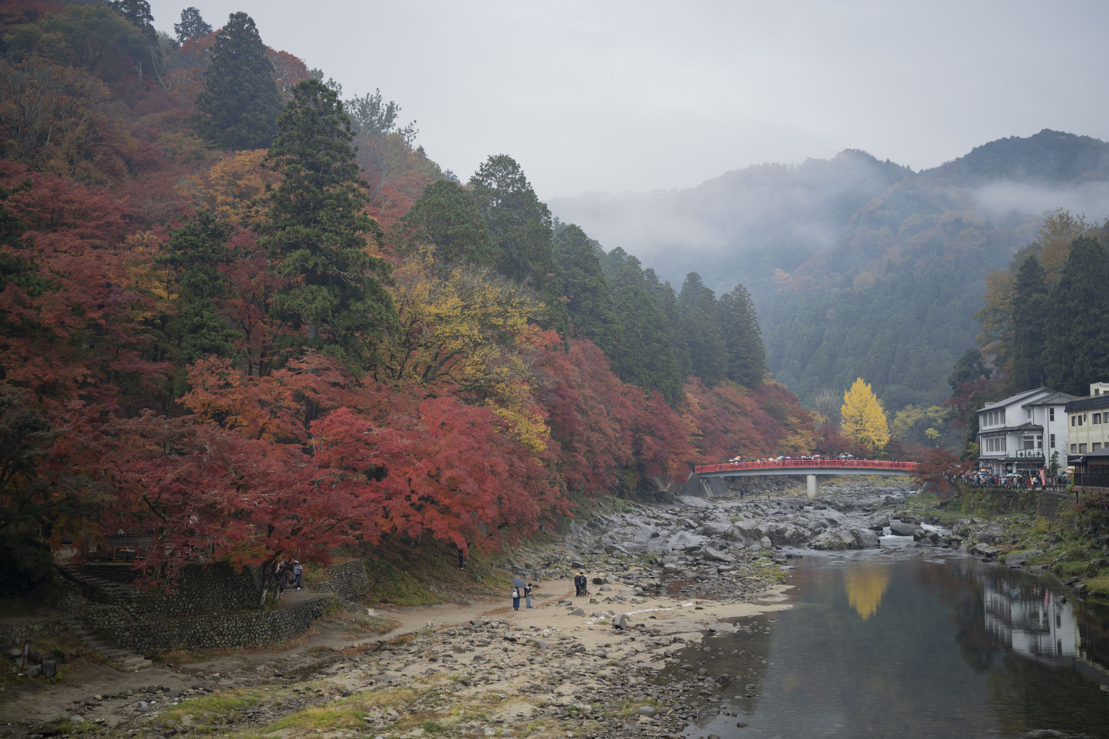 愛知県豊田市の香嵐渓です。雨と霧がかかっていましたが綺麗でした。