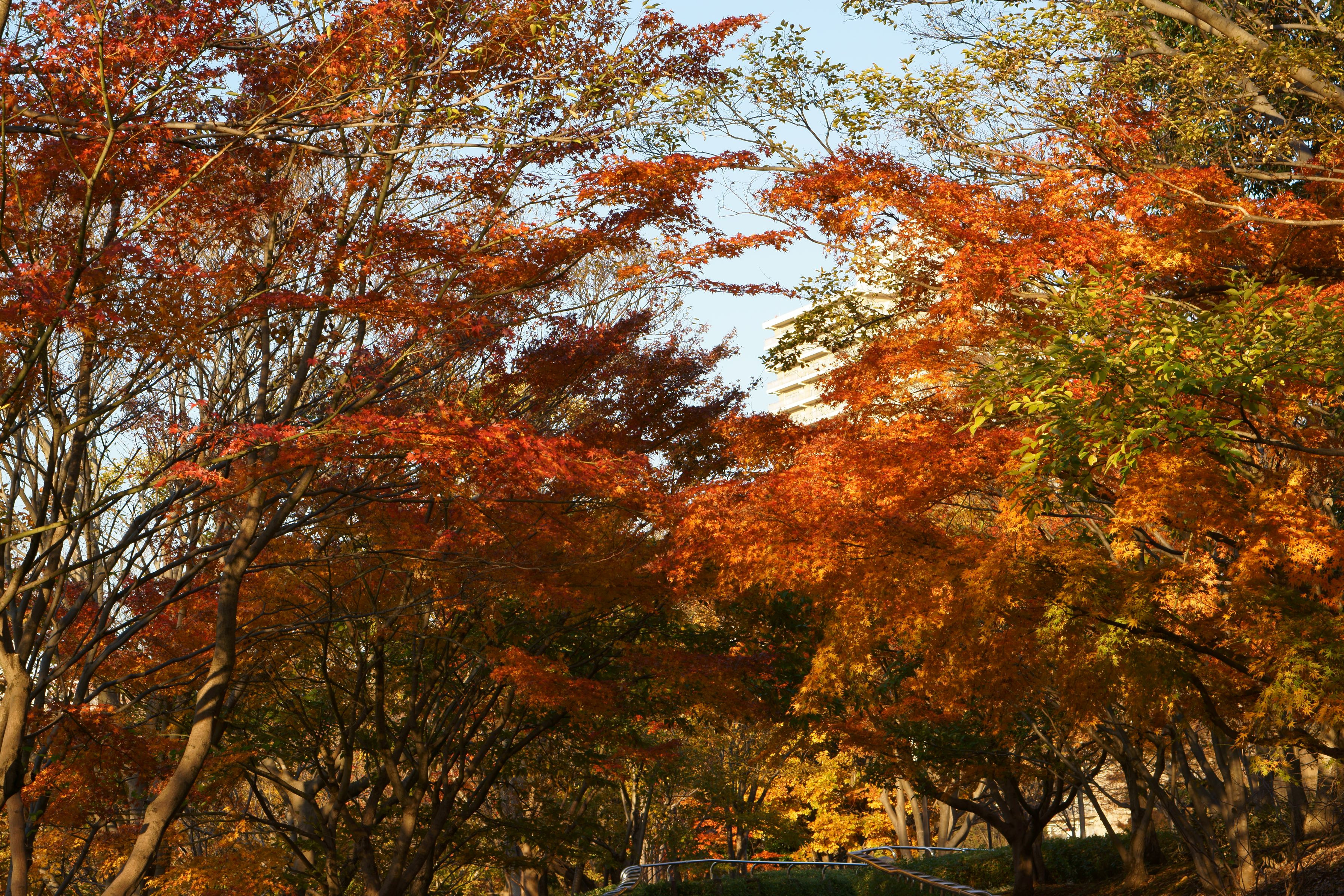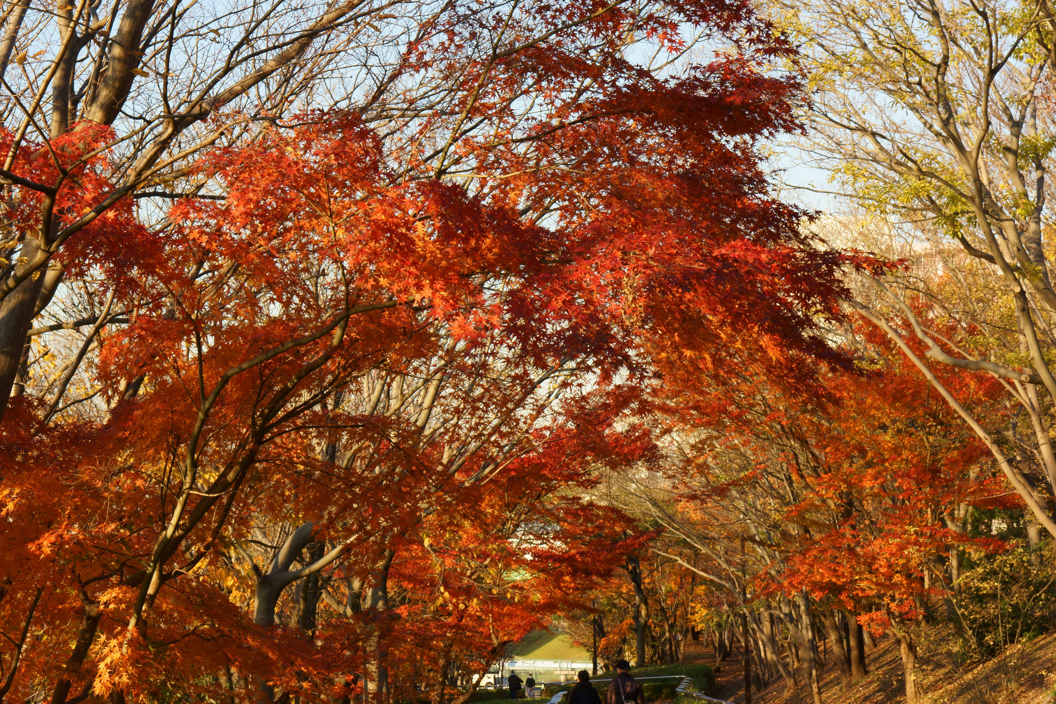 通路の両側から張り出した枝が紅葉して、紅葉のアーチを造ってます。