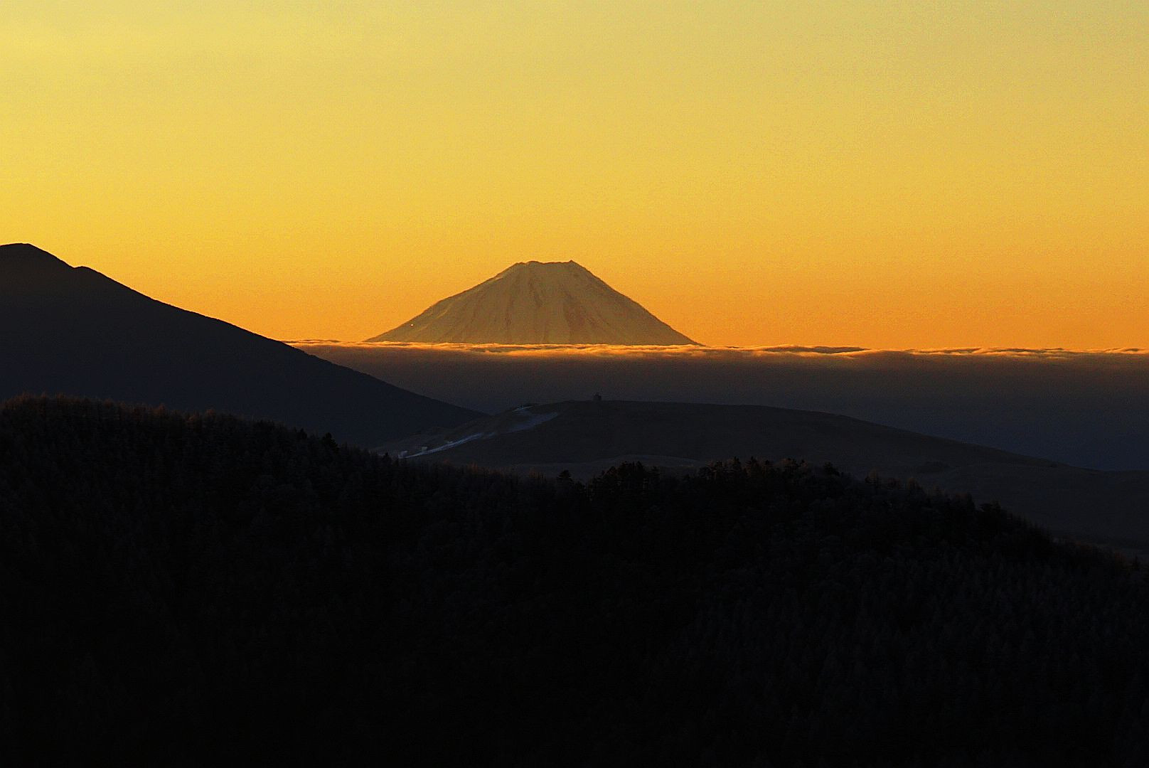 美ヶ原高原から日の出が映し出した富士山と雲海。