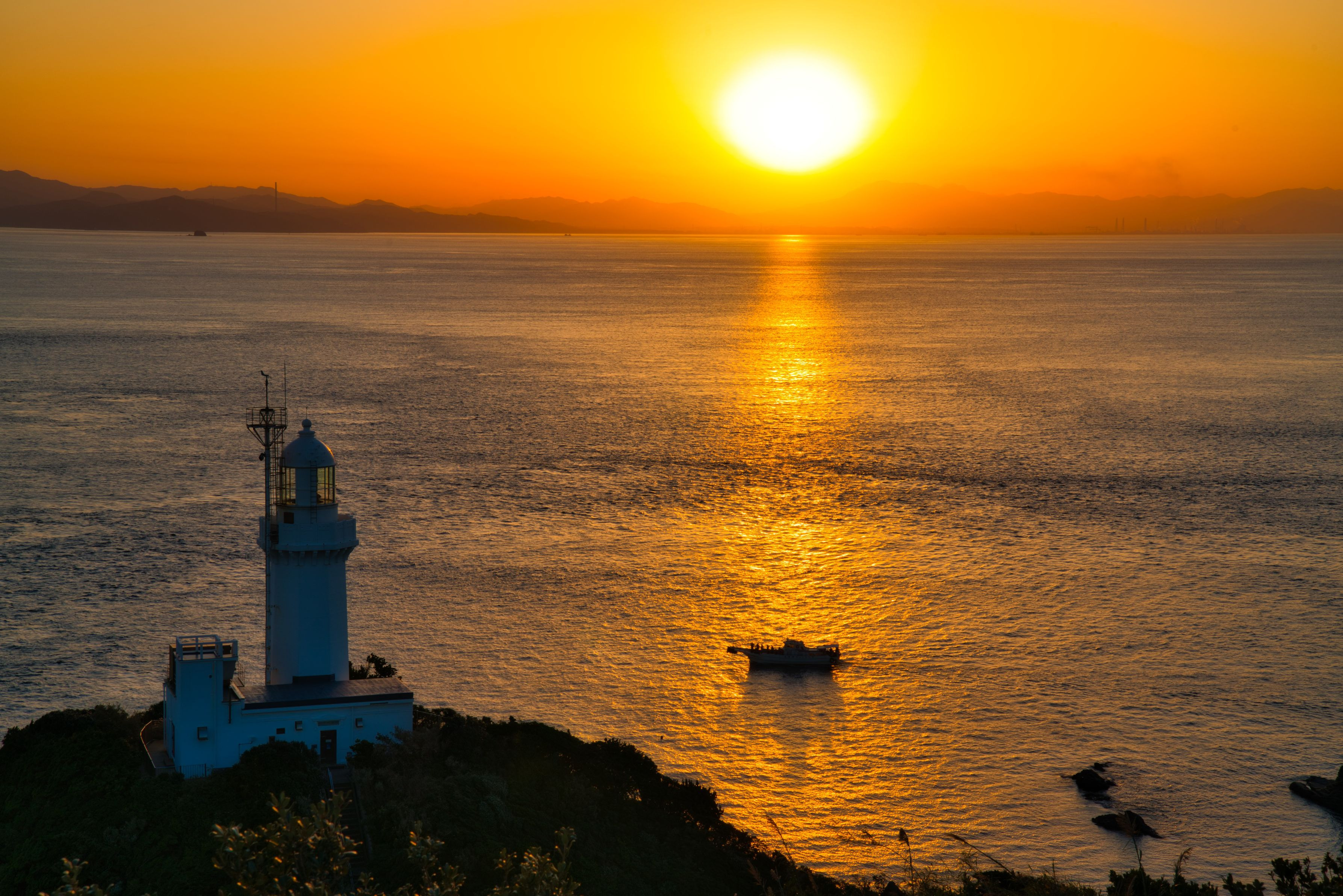 海にできた光の道を運よく船がと通り過ぎました