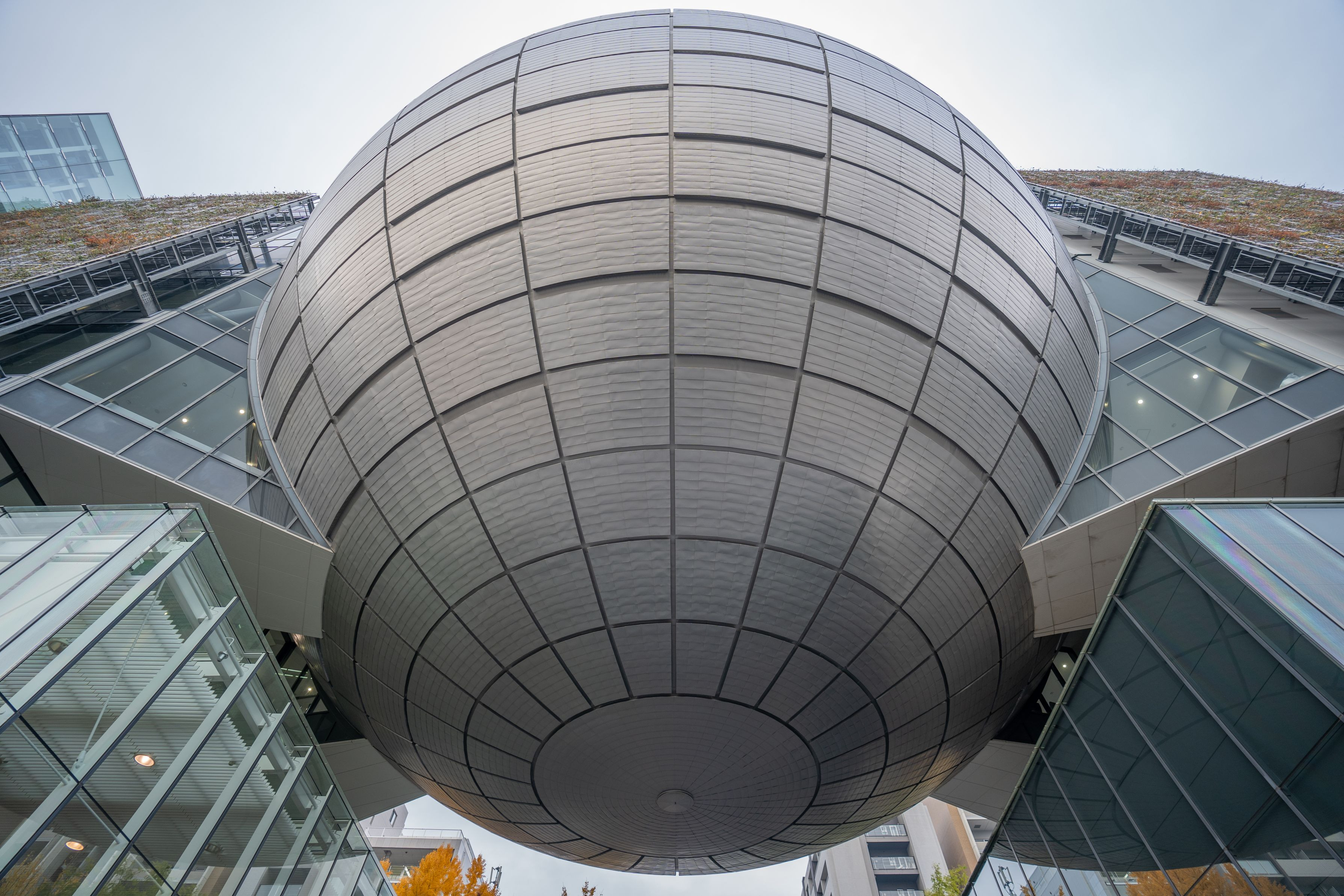 あいにくの雨で球体の真下から Adobe Lightroomでコントラストを調整しています