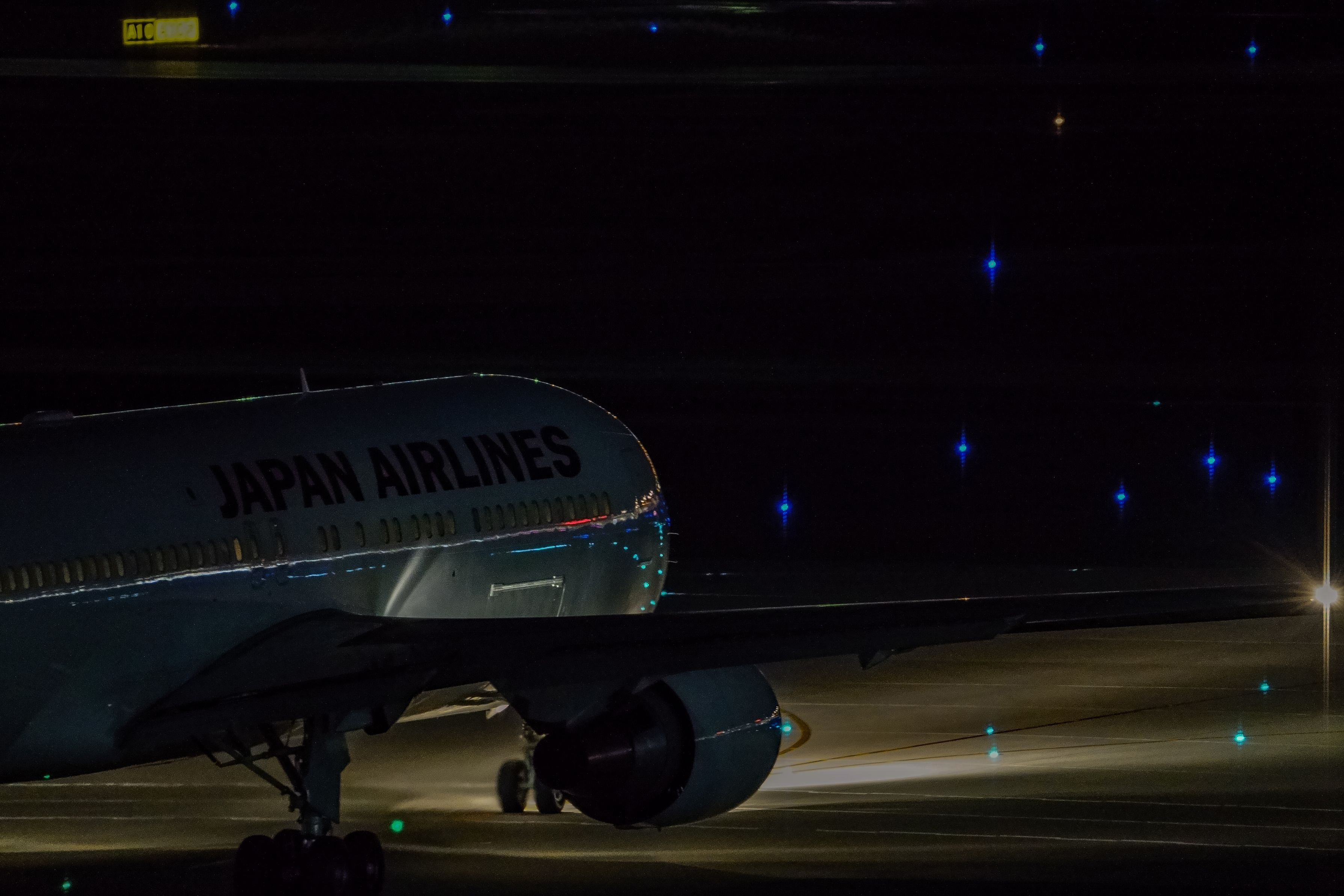 夜のとばりの中タキシングする767に光のすじが映し出されました