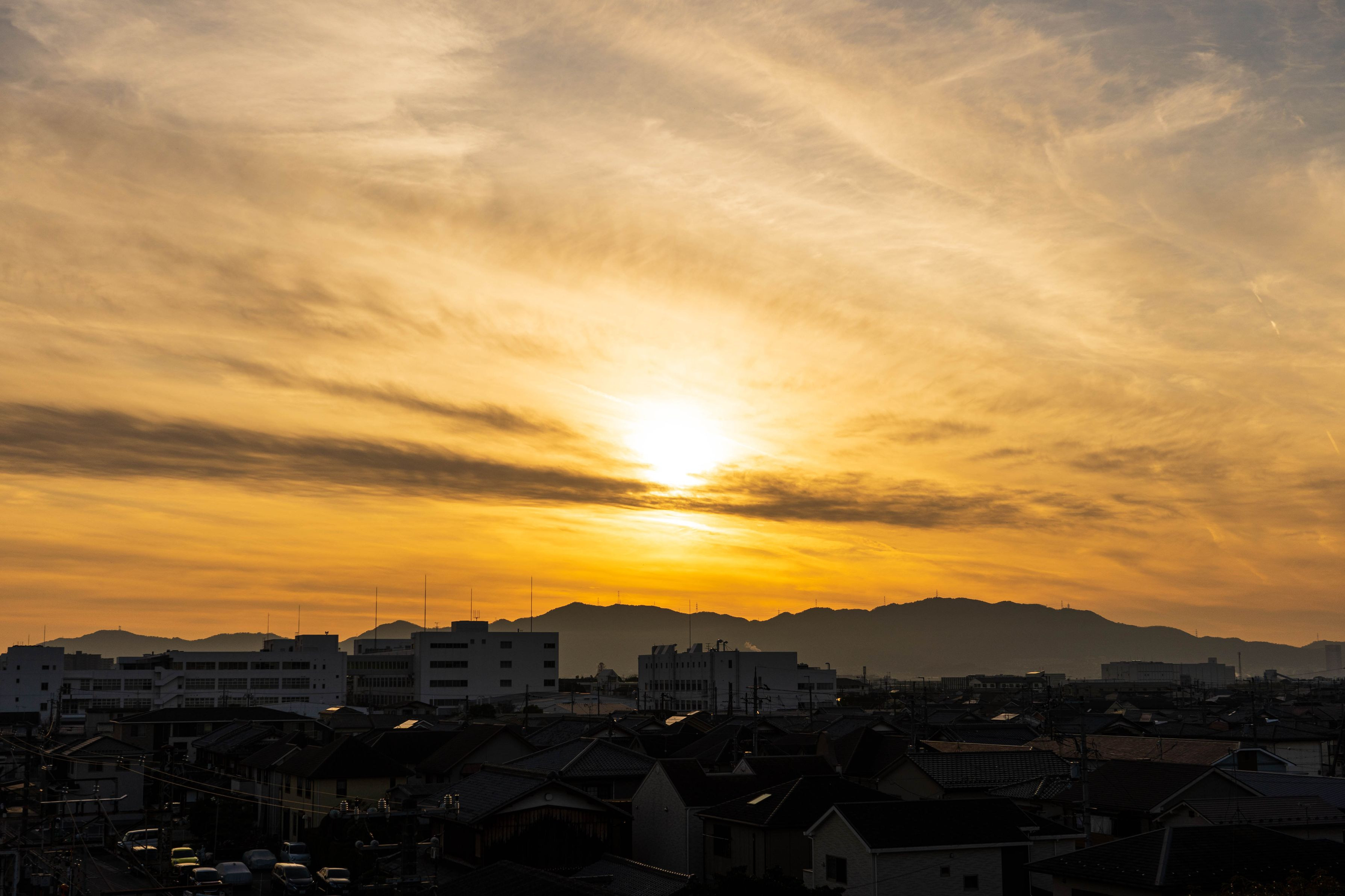 本日撮影した夕日です。滋賀県の西部比叡山方向へ沈む夕日です。 撮影機材:α7Ⅲ ISO:100 F値:11 シャッター:1/400