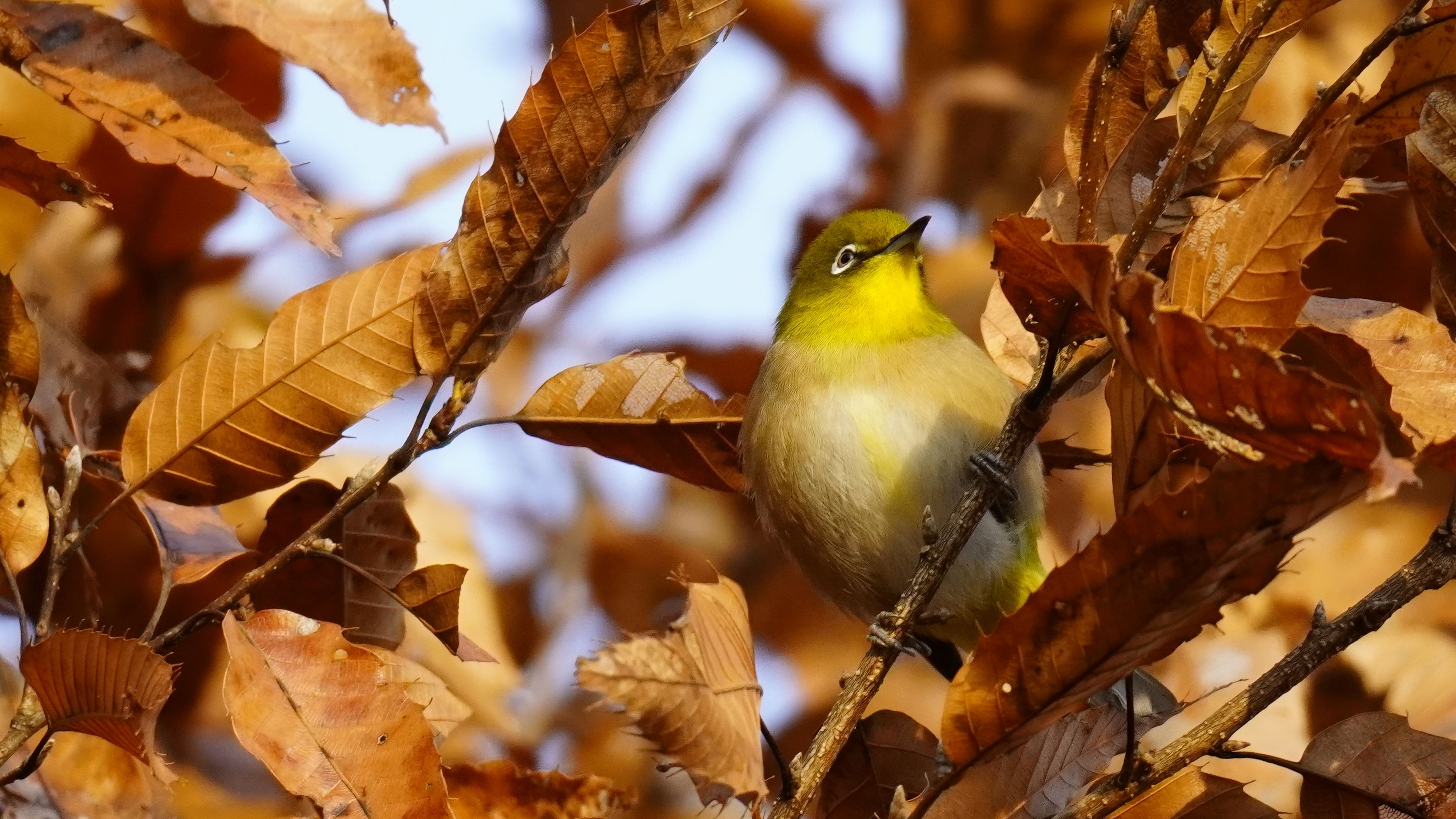 朝早く、大正池へ 紅葉とメジロ
