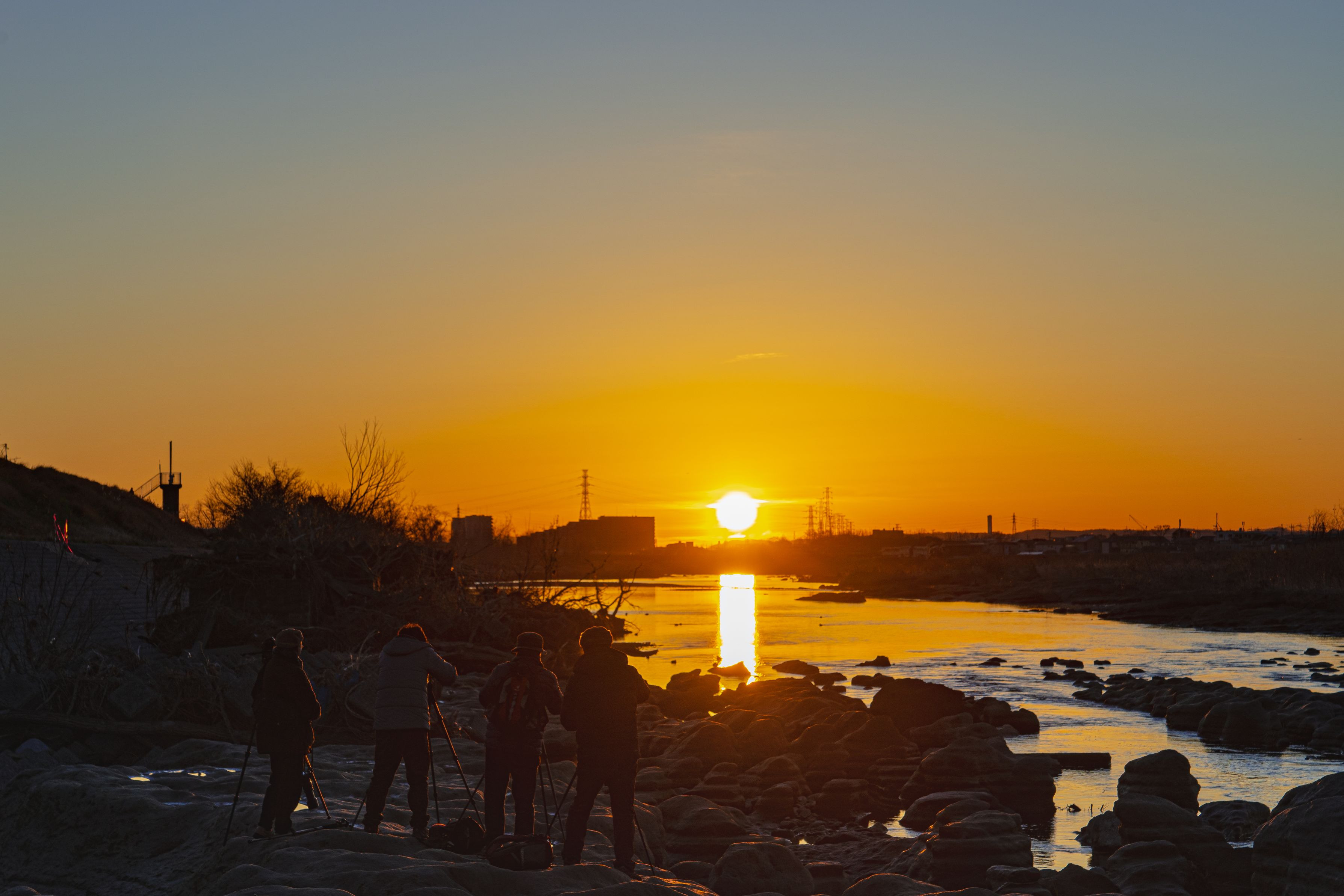寒い朝、朝日を待つ人々…川霧が出たら良かったなぁ…。