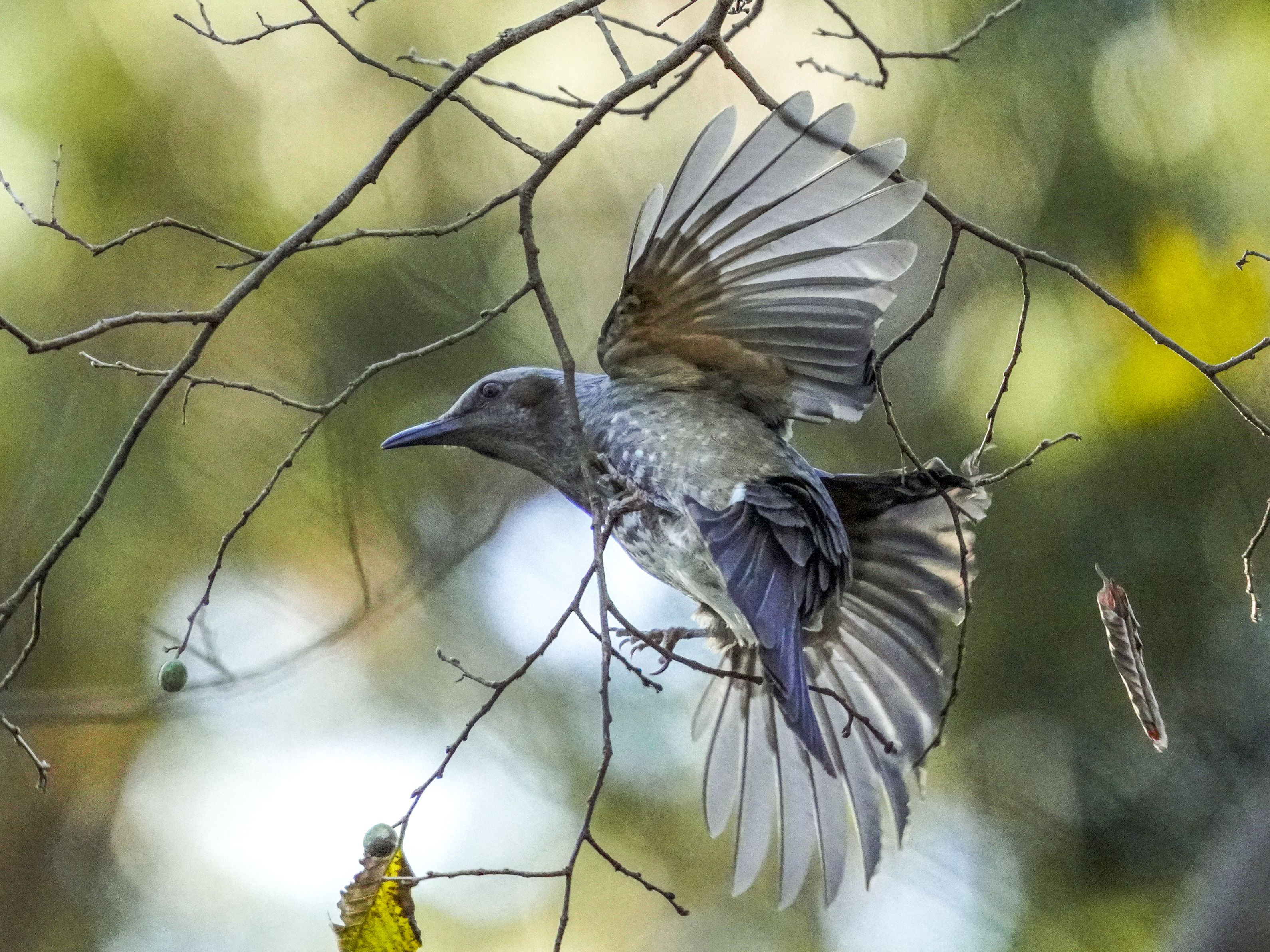 森の中では、やはりヒヨドリが 縦横無尽に飛び回っていました シルエットがきれいですね この後、木の実を咥えて、ごちそうさま。
