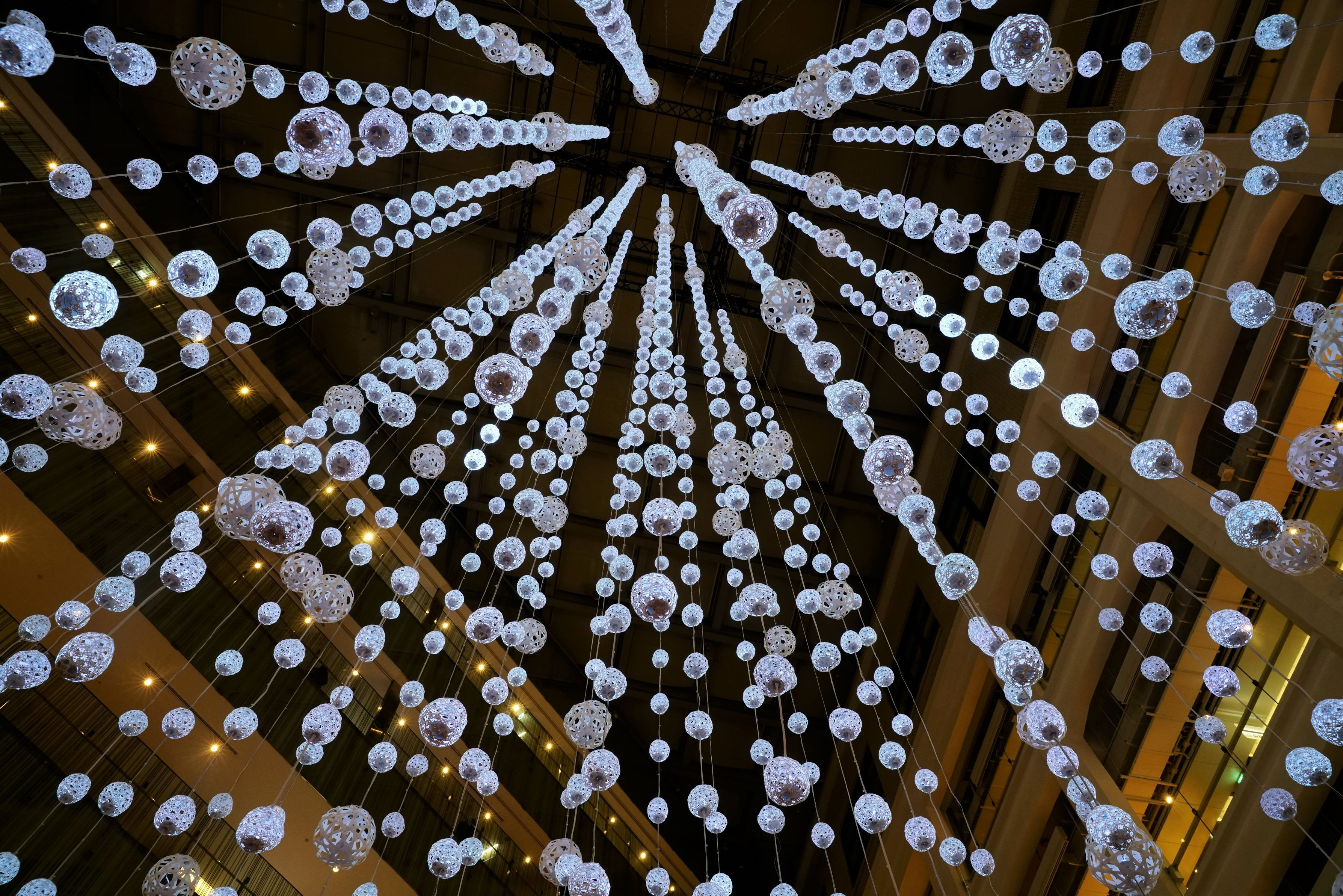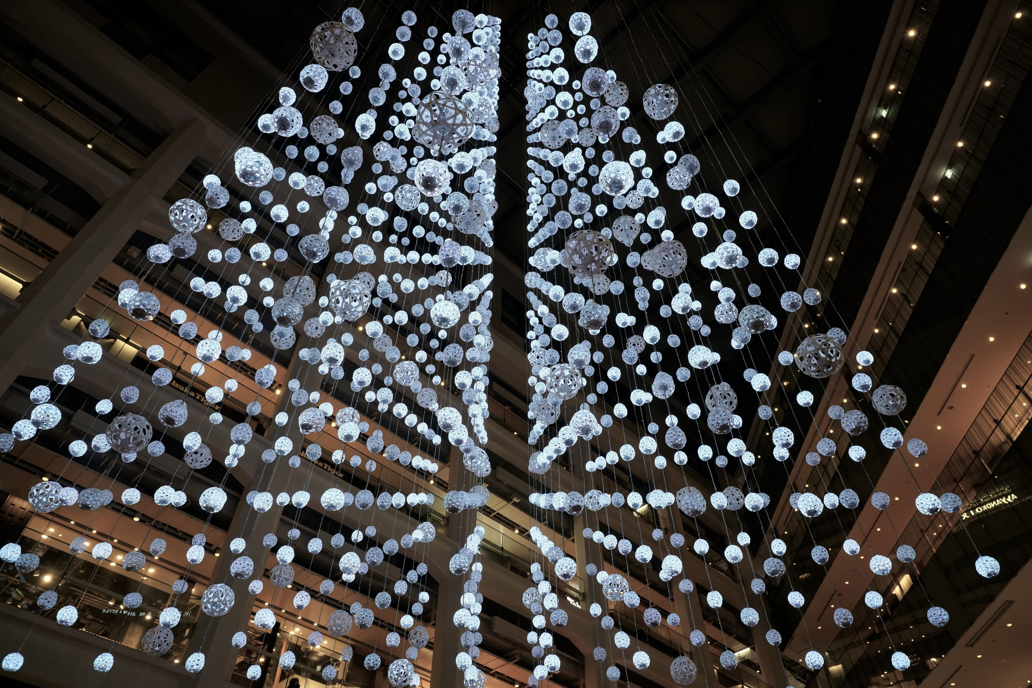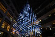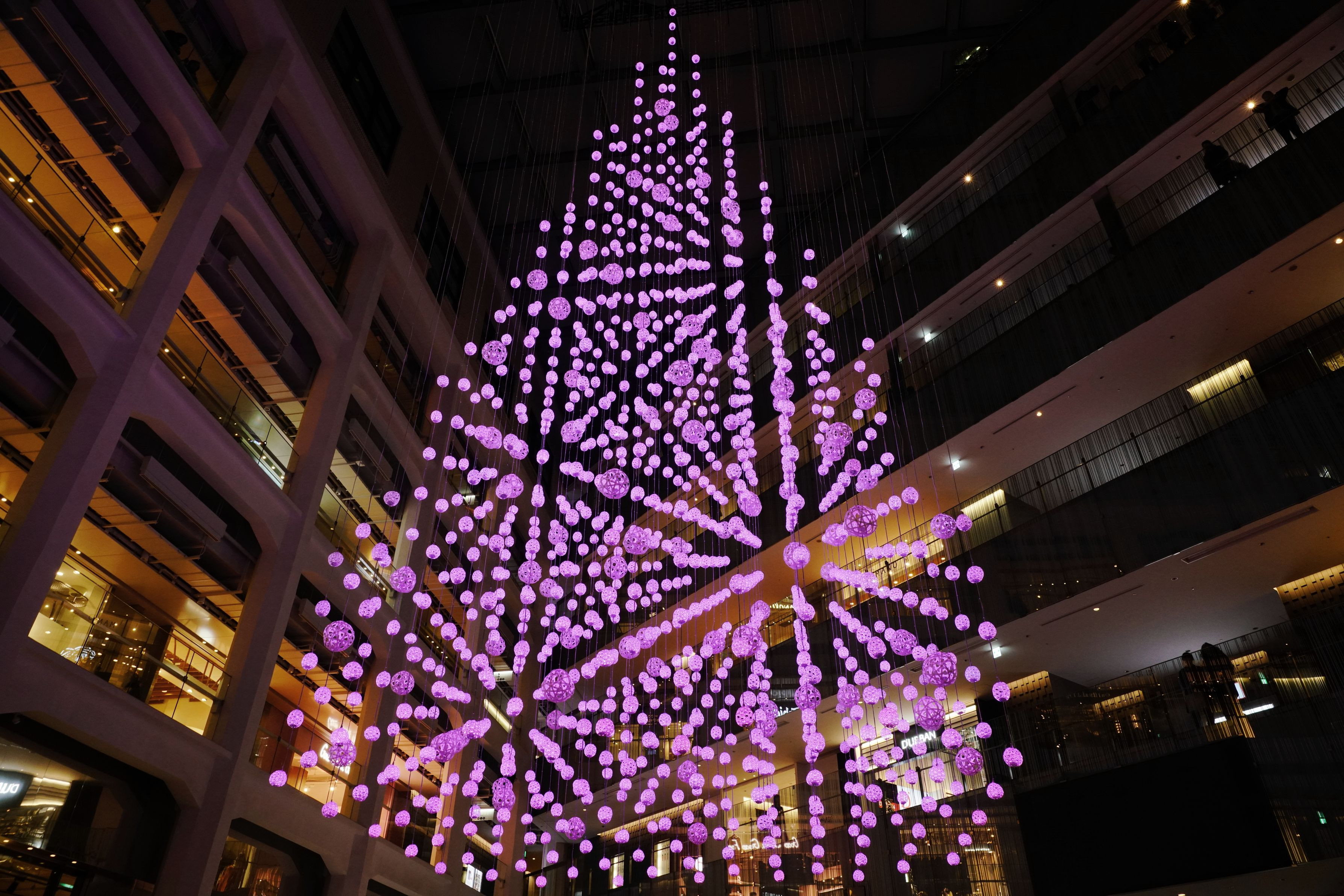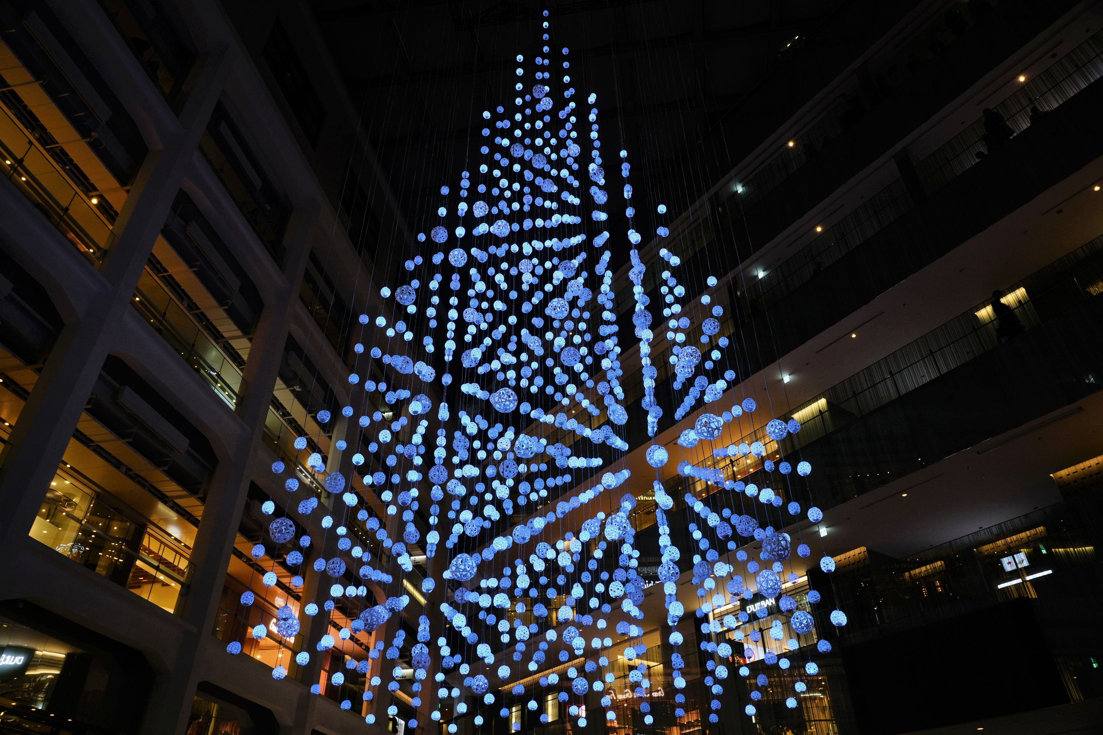 kitte 水引を天井から吊り下げたXmasツリー 中にLEDが仕込まれていて光ります。 場所によっては、水引の並びが揃うポイントがあり、不思議な感じに。