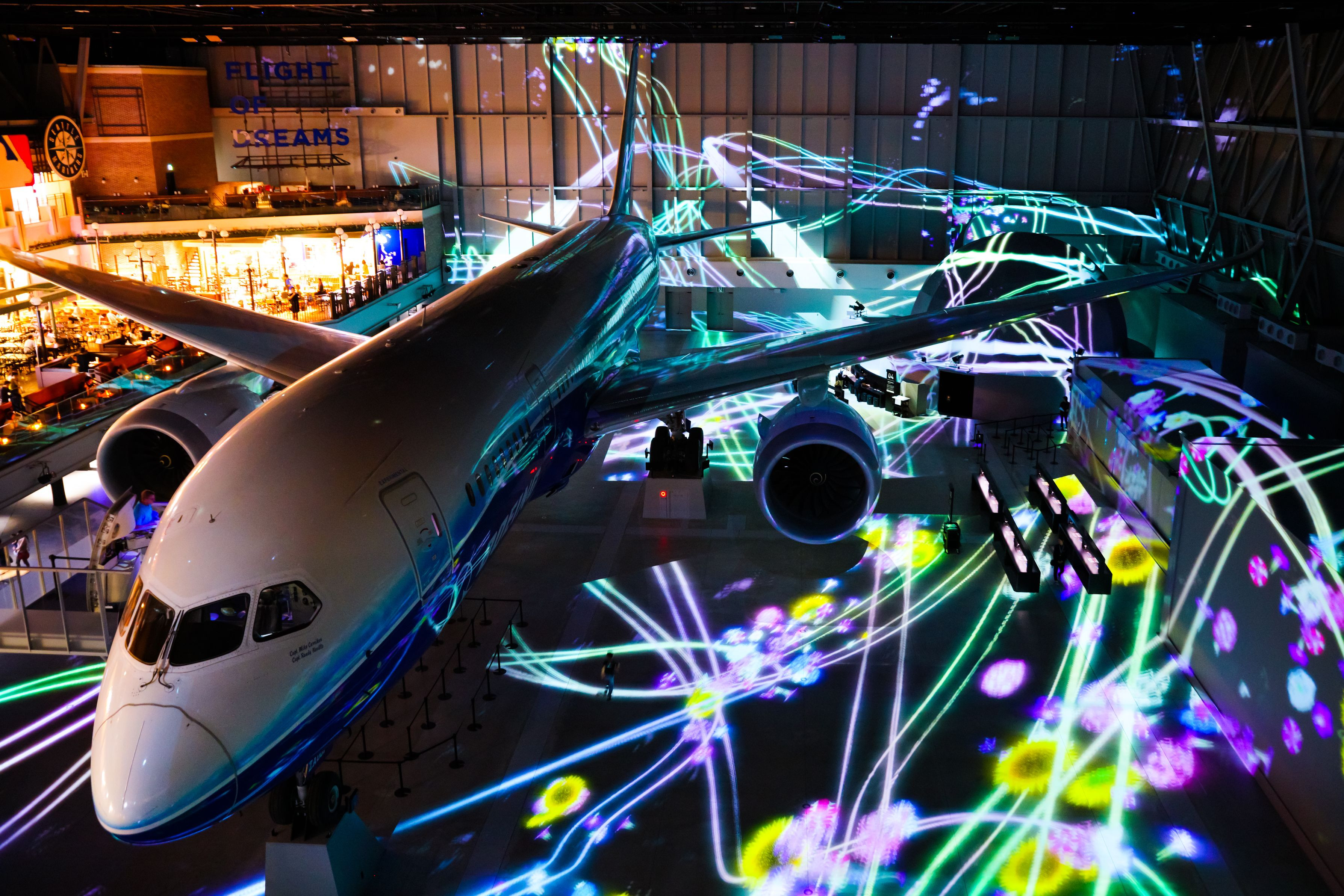中部国際空港にある施設Flight of Dreams. B787初号機を目の前で楽しむことができる。 飛行機好きもそうでない人も感動すること請け合い。 30分に1回、プロジェクションマッピングが行われており、その時の一枚。