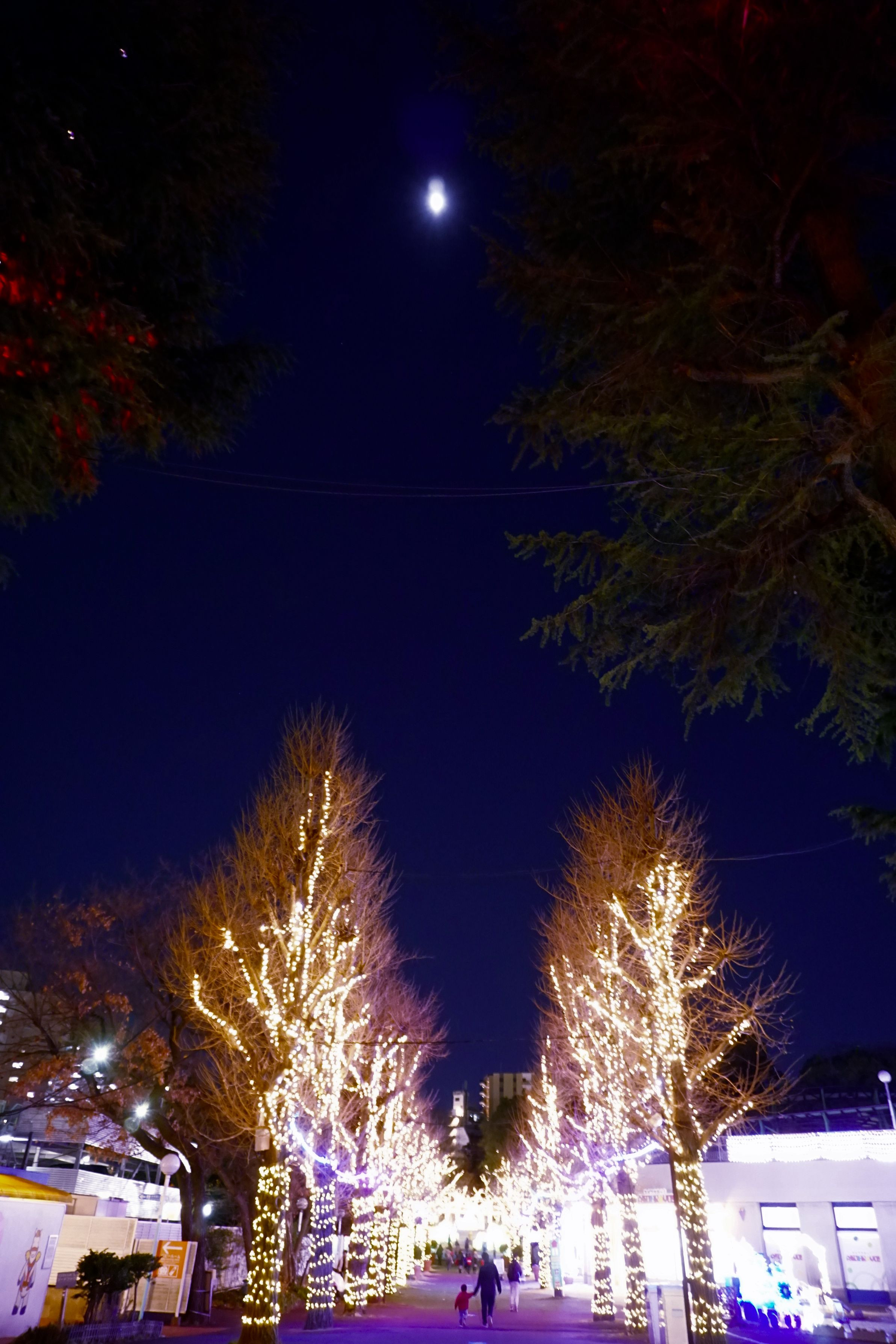 ライトアップされた並木と頭上に輝く月が綺麗でした