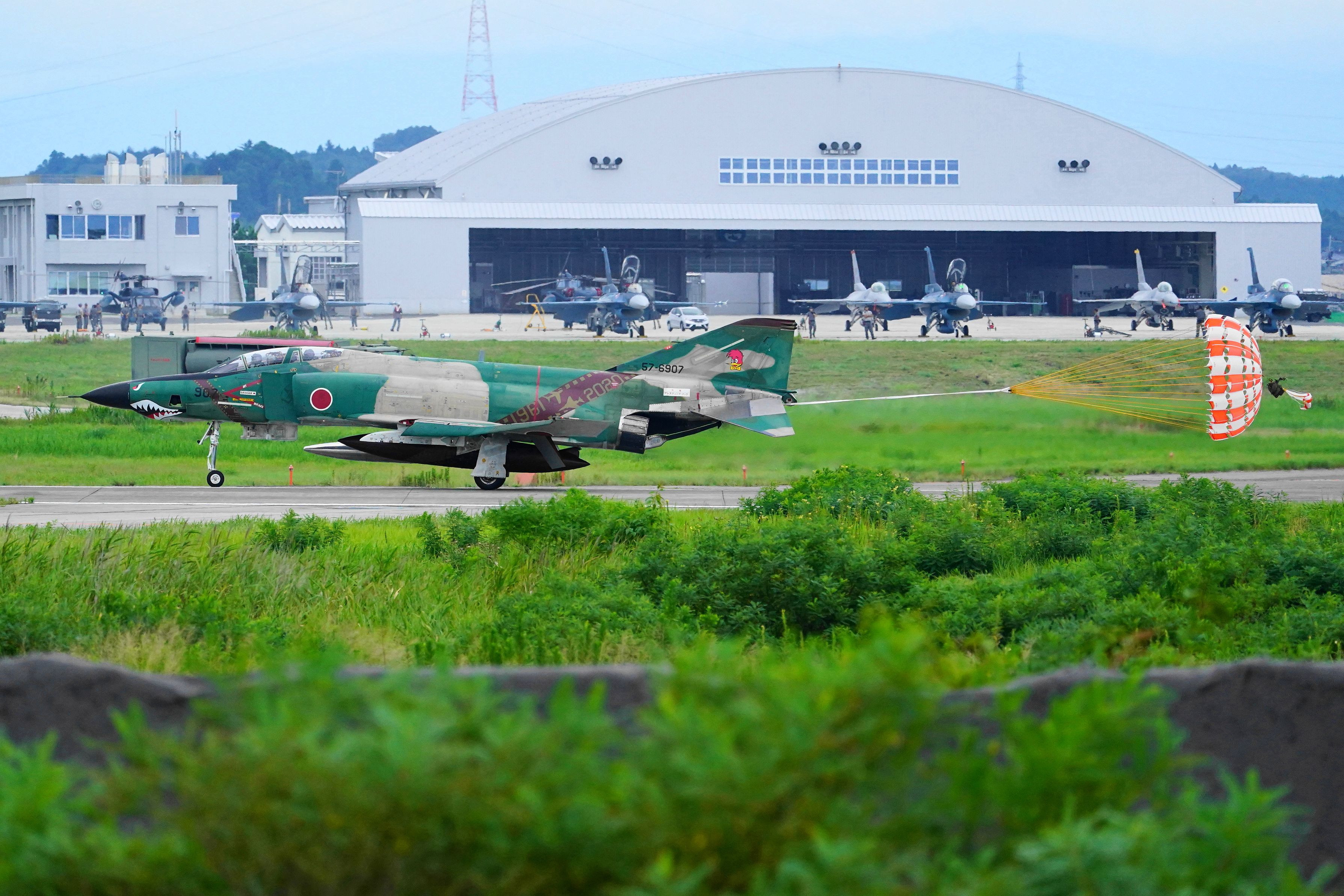 松島基地航空祭展示のため、航空祭事前訓練前日に飛来した。特別塗装のRF4。格納庫前の米太平洋空軍三沢基地所属アクロバットチームF16、三菱F2B列線前を整備員等が見守るなか、ドラックシュートを展開、着陸してきました。もう、RF4が松島基地には飛来することはないと思います。