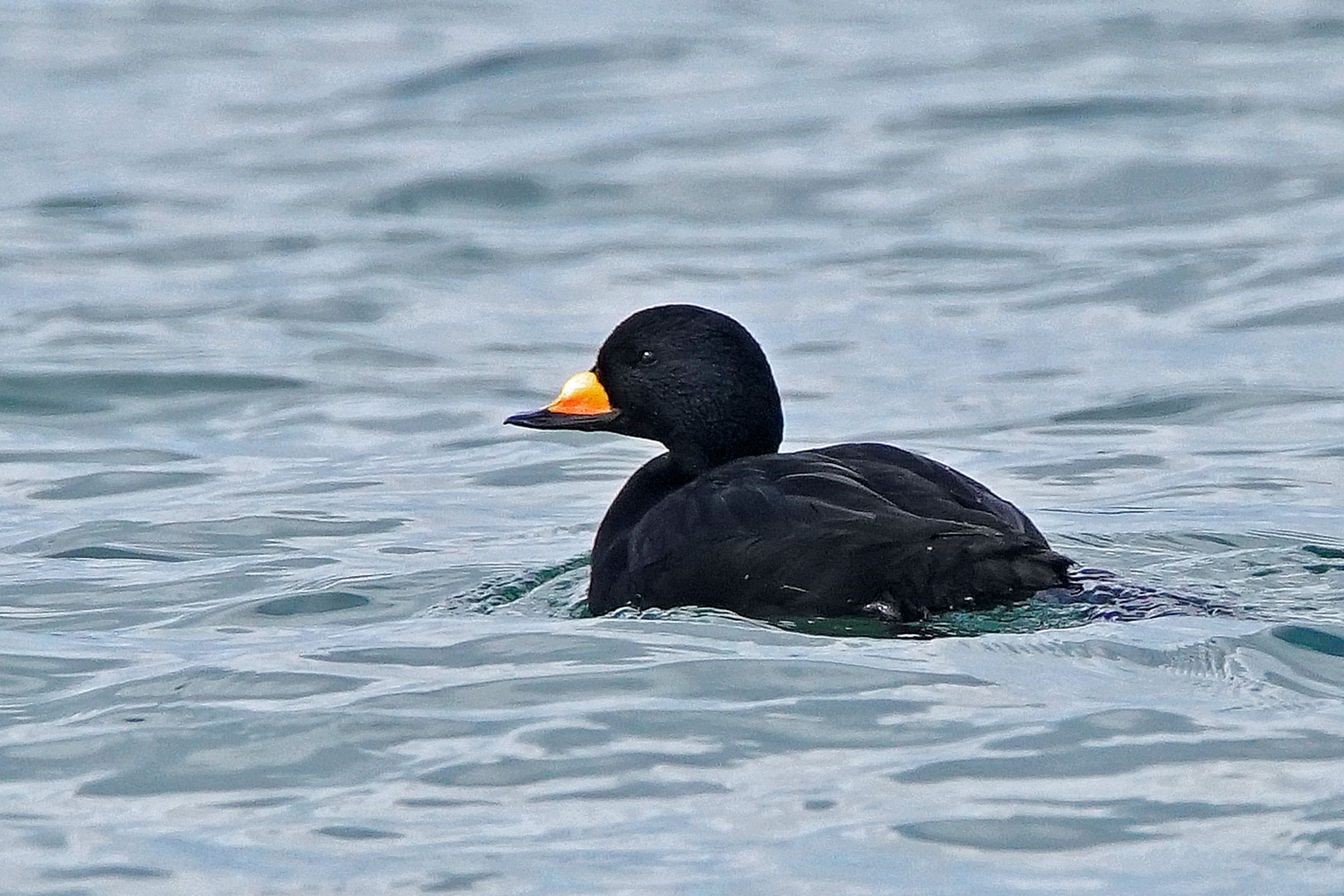 #クロガモ#の雄は、全身が真っ黒。 上嘴の基部がふくらんで橙黄色がトレードマーク。
