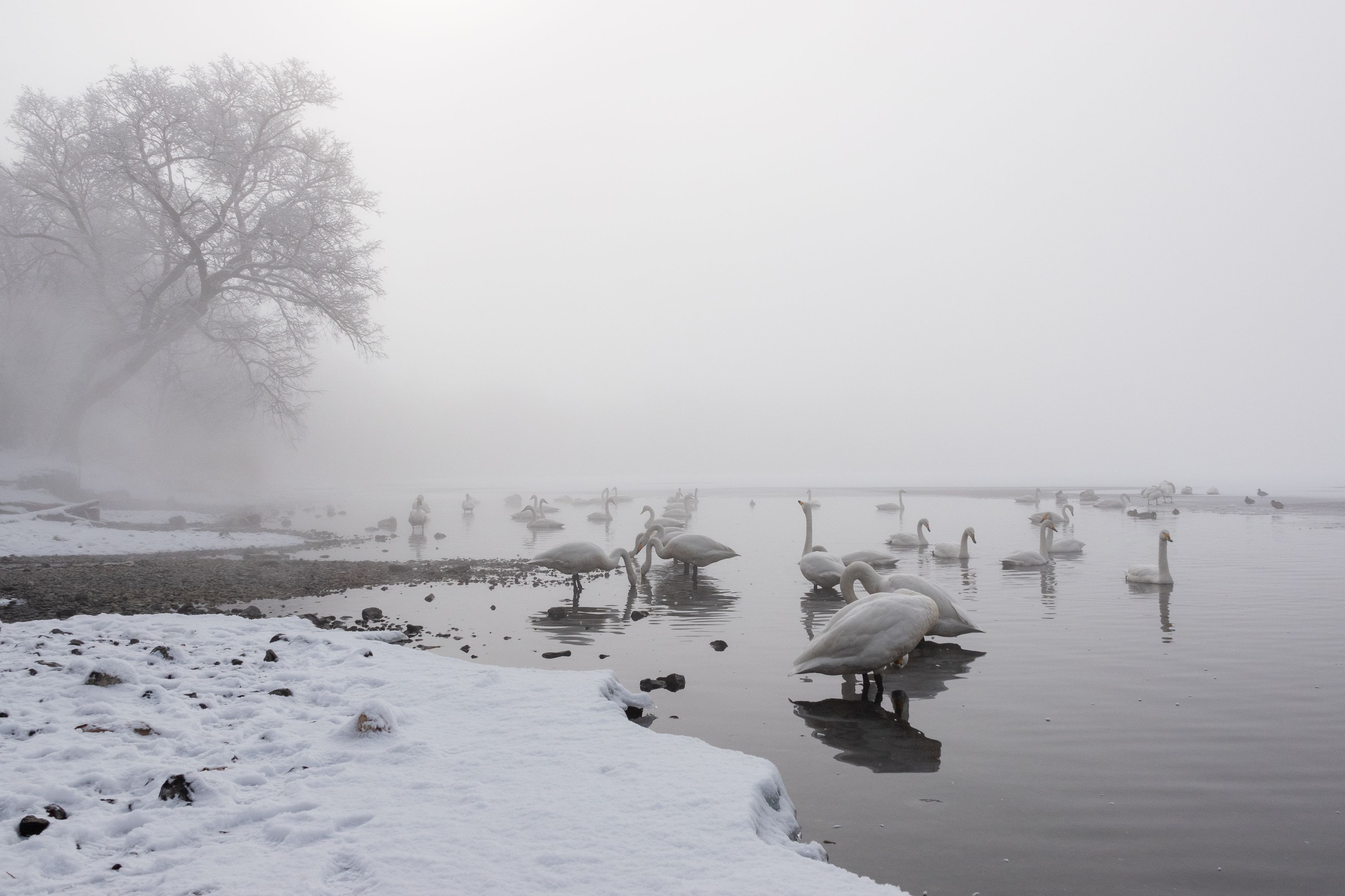 屈斜路湖畔の温泉に集まってくるオオハクチョウの群れ SONY RX10m4