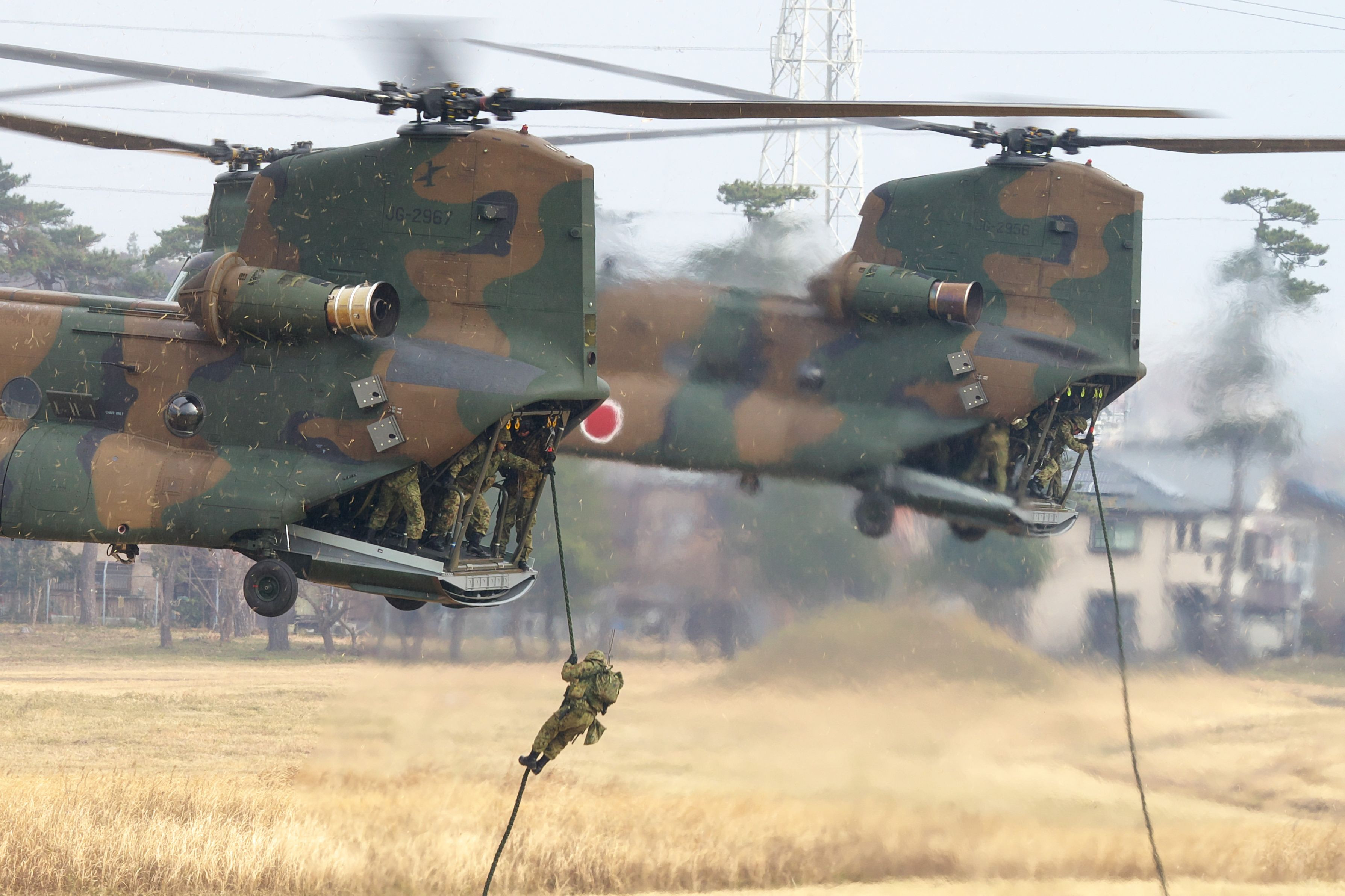 寒い中、今年の降下訓練始めに行って来ました。 小雨もぱらつく中、相変わらず派手な演習でした。