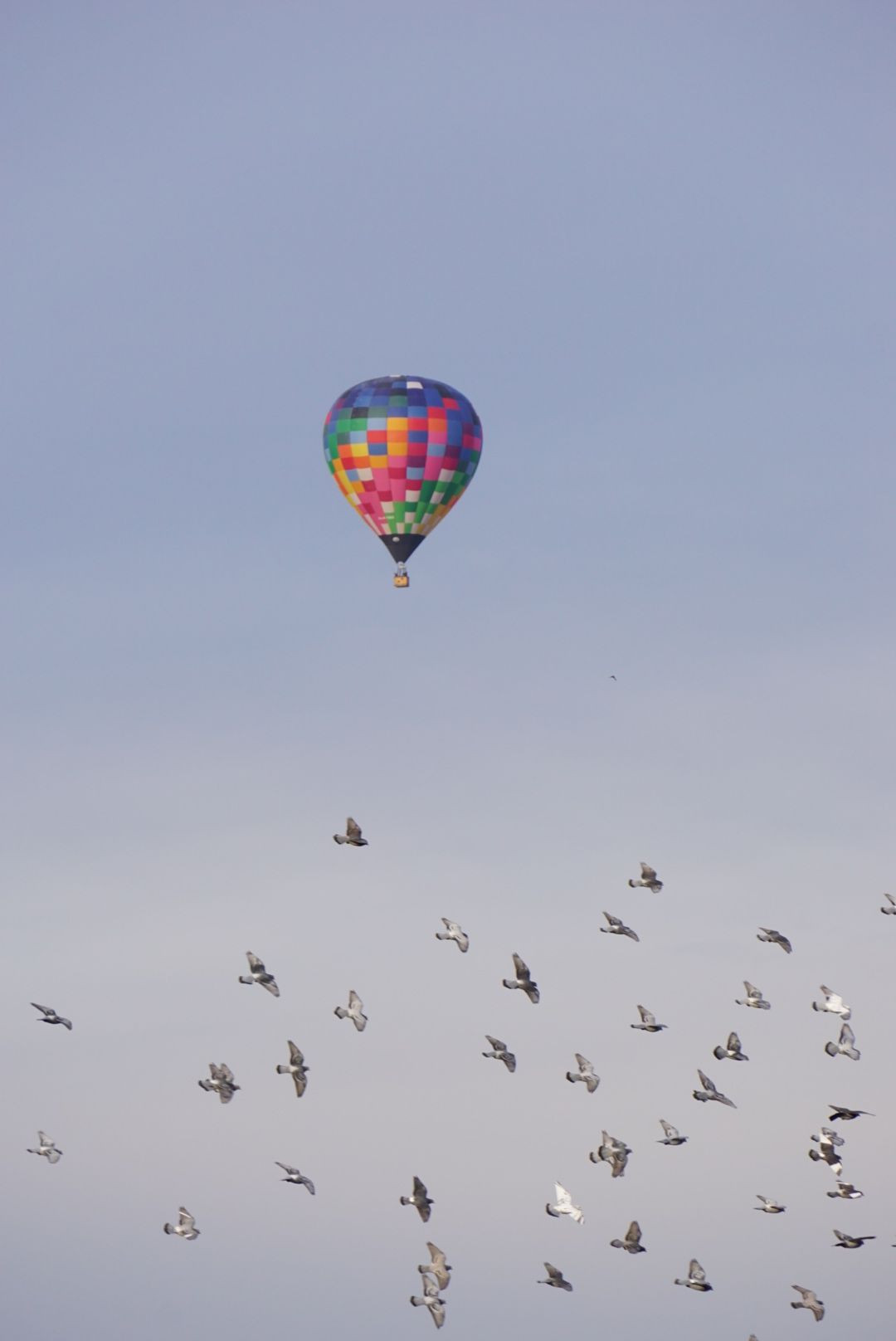 綺麗な気球が家の近くを飛んでいたので^ ^ 設定を色々変えていたら突然、鳩?の群が!突然のシャッターチャンスに慌ててシャッター押したら、ピントがいまいち合っていませんでしたー(^^;;