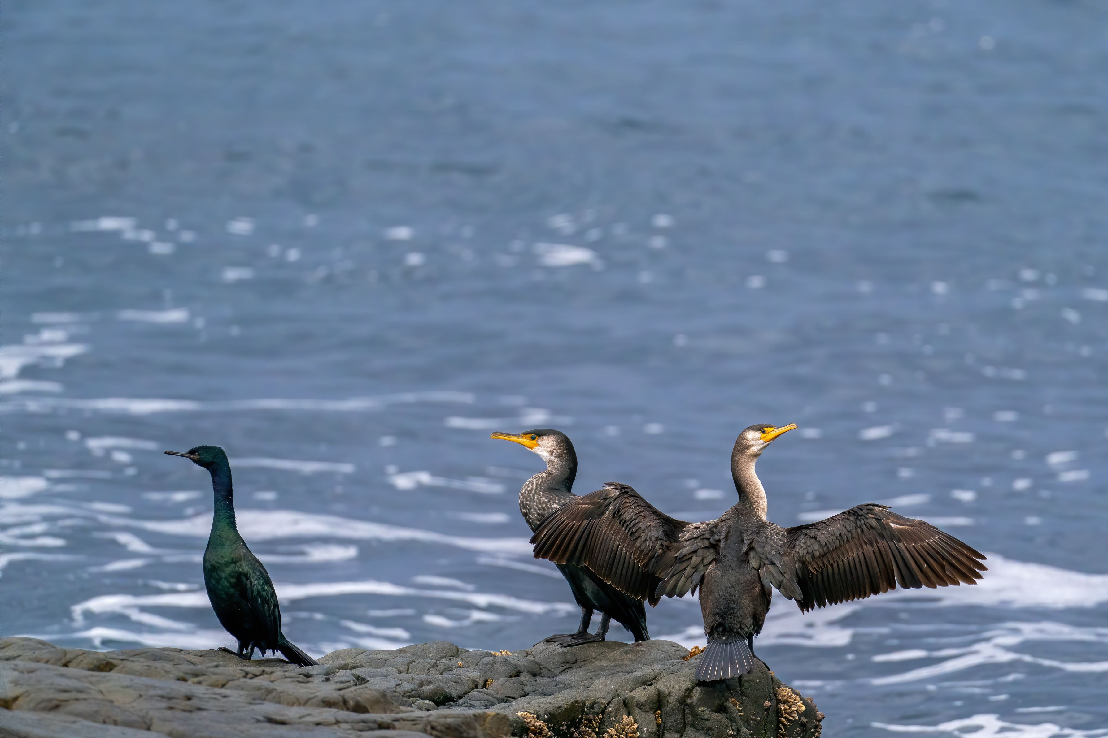 左がヒメウ、右はカワウです。 カワウなどは羽が水をはじかないので潜った後は羽を乾かすことが多いです。