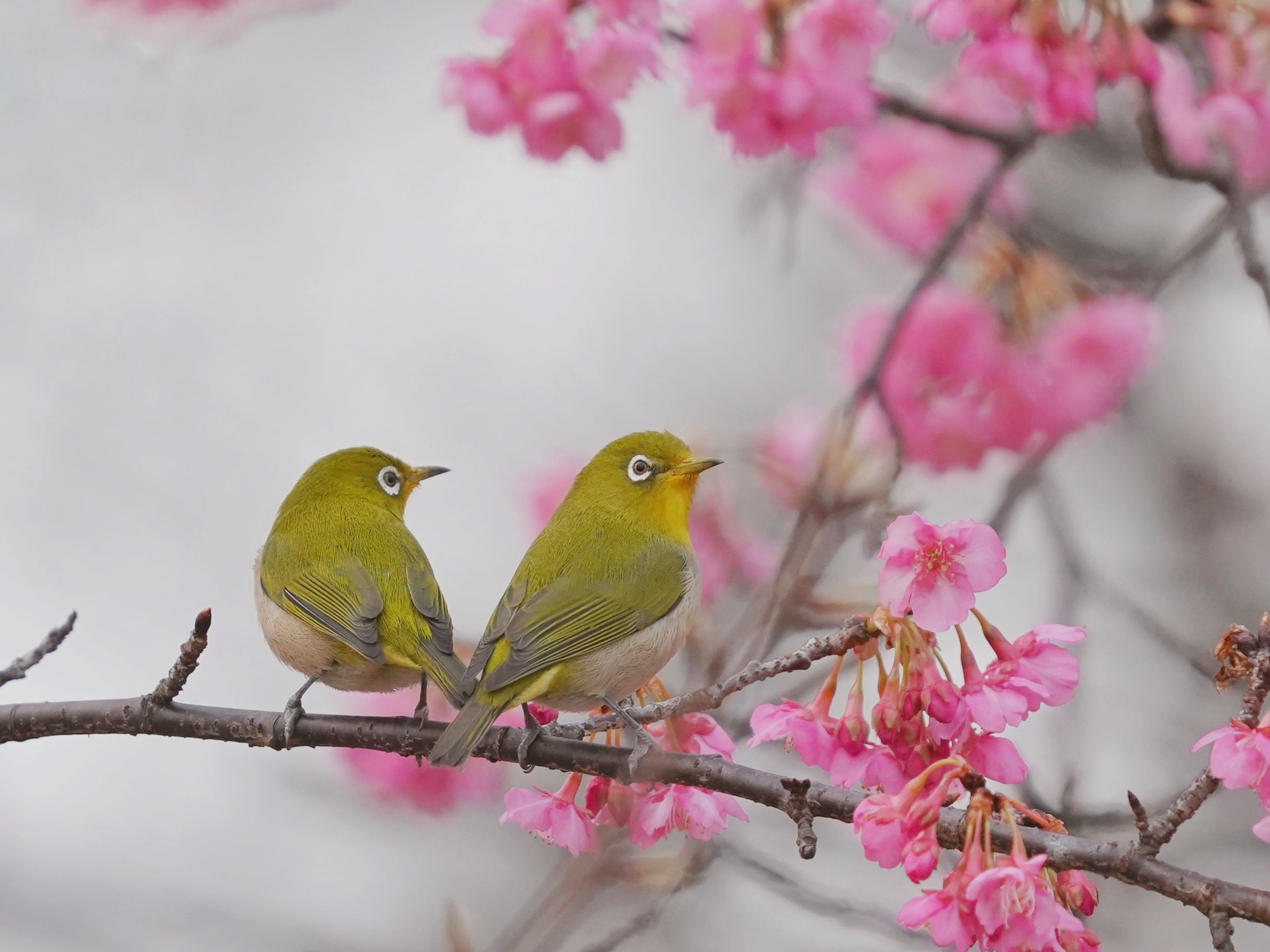 うちの近くに一足早く河津桜が咲いていました。 仲良しメジロ、、ちょっぴりハートにみえる❤︎ 光加減が微妙かと思いましたが、かえっていい雰囲気に。