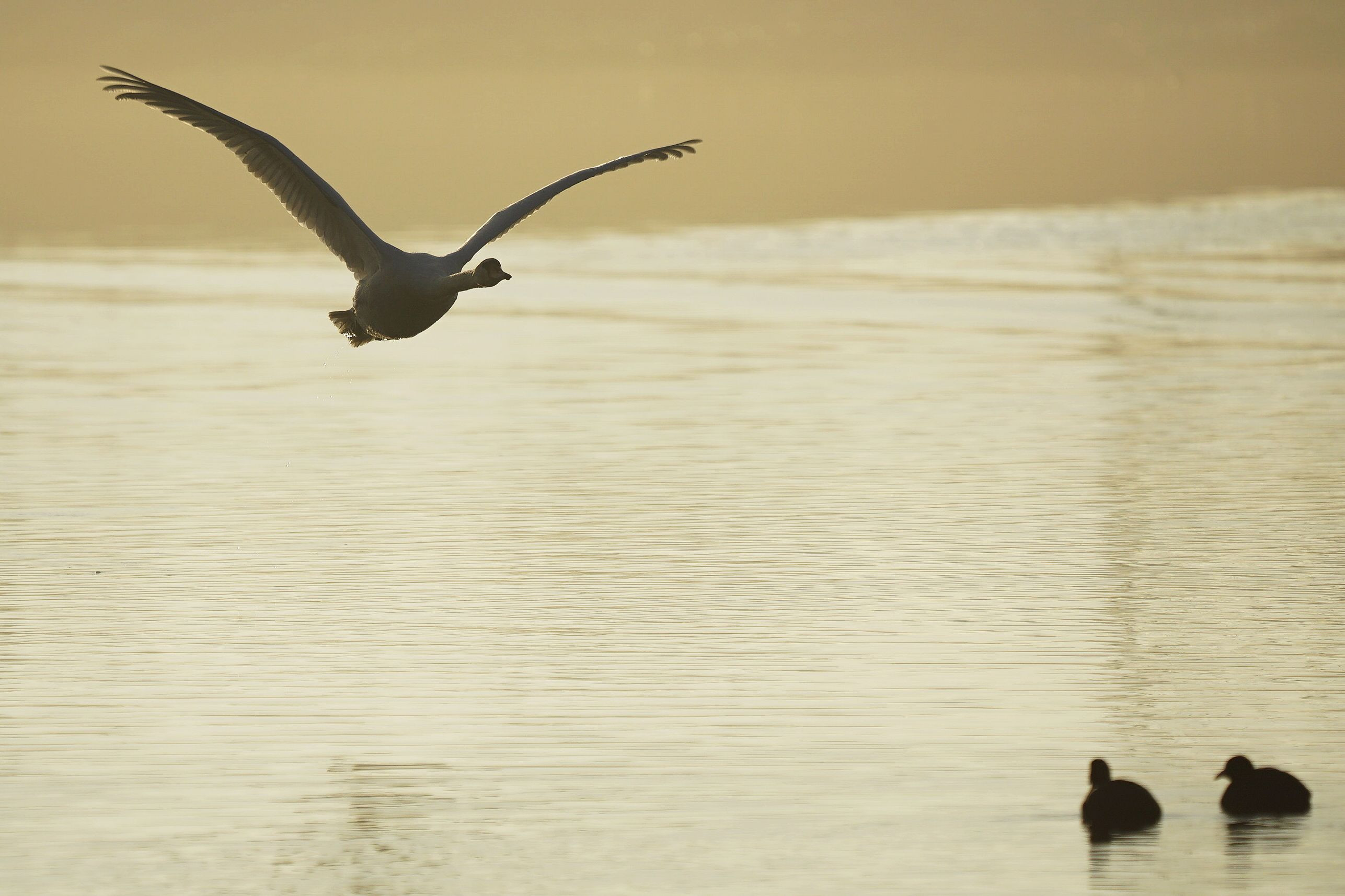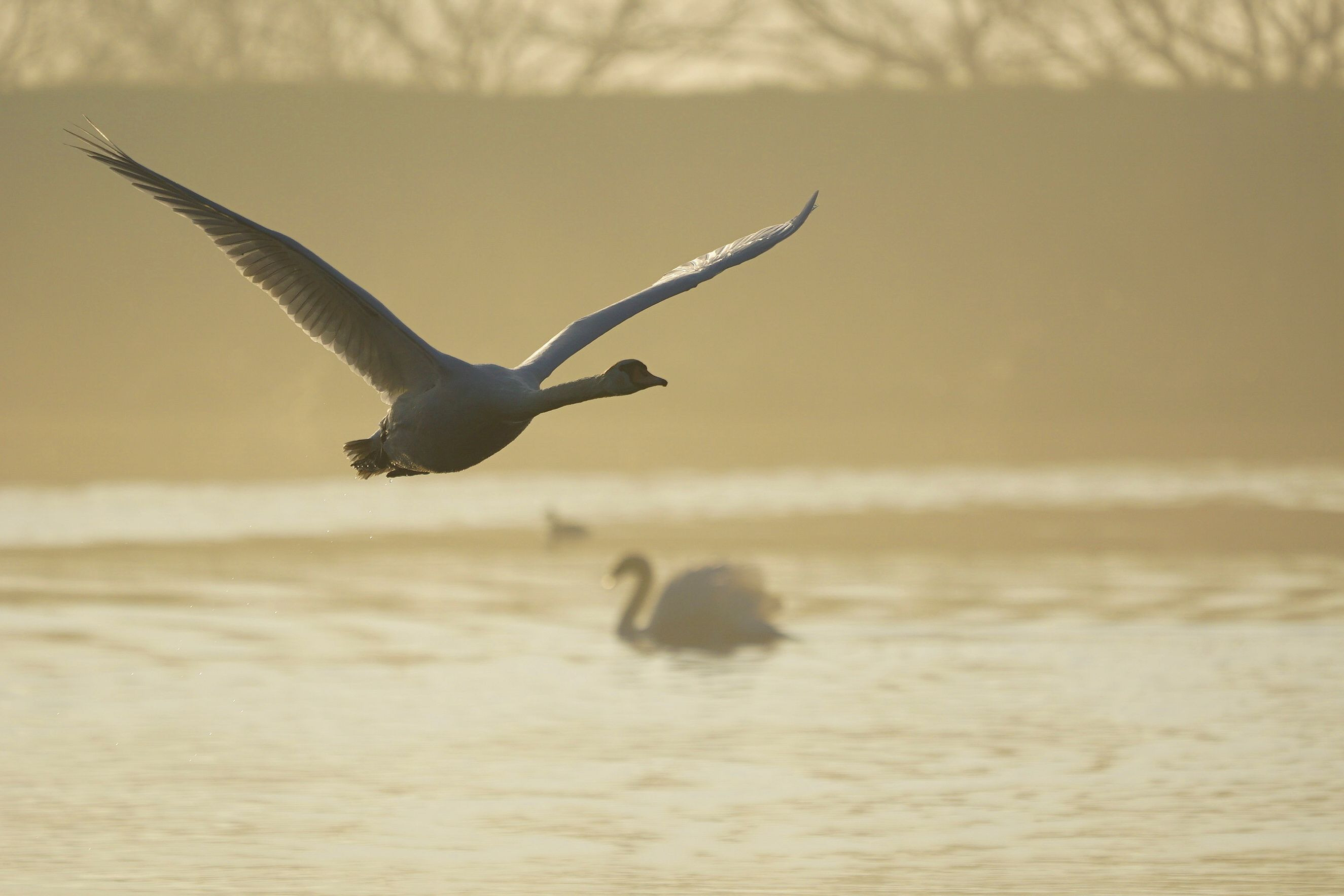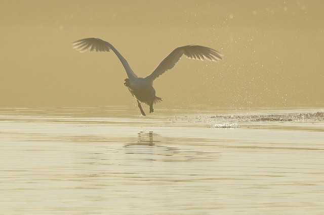 コブハクチョウが大空へと羽ばたいていきました。