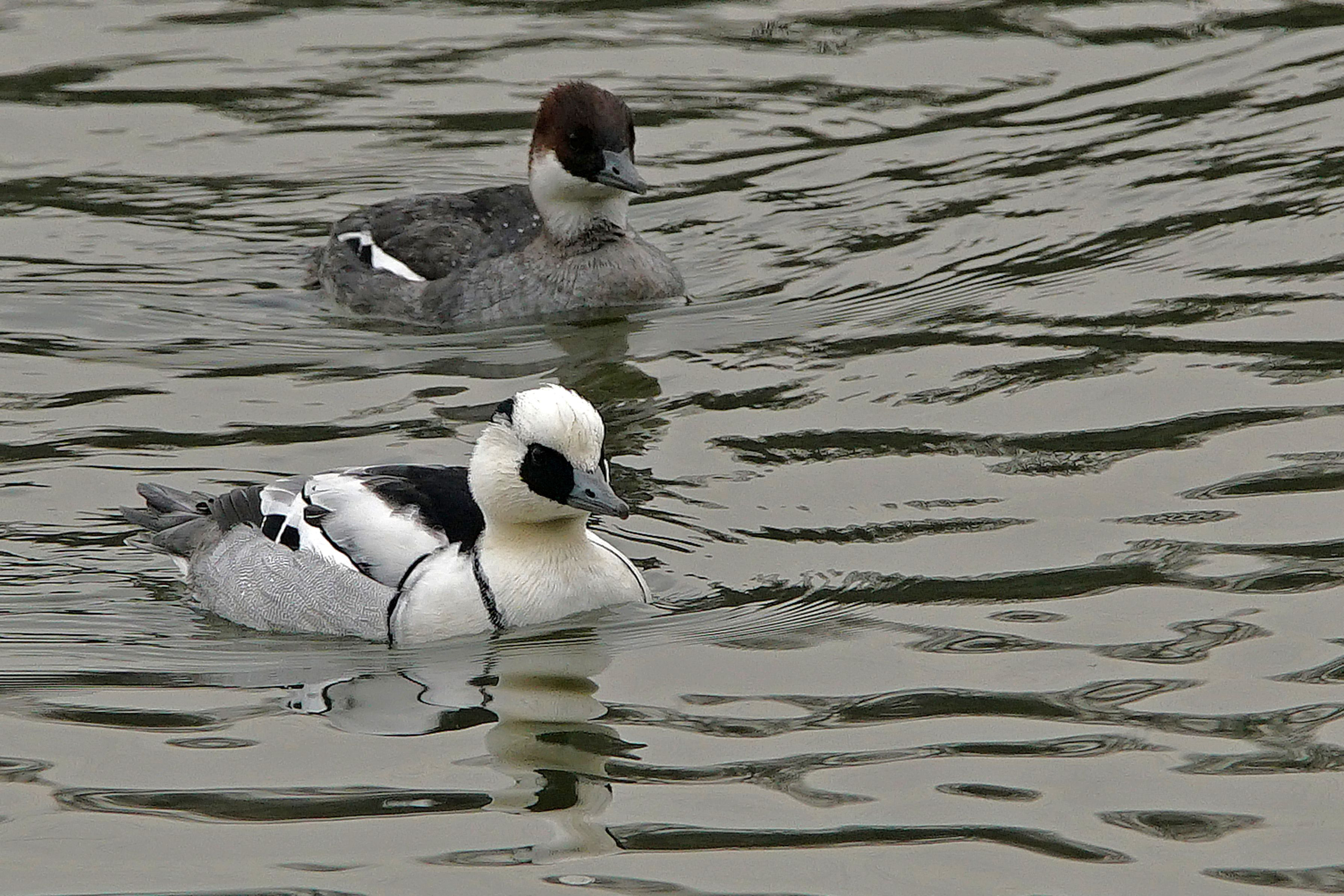 #ミコアイサ#は「パンダ」のニックネームで 呼ばれている。 公園の広い池で彼♀とデートをしていた。