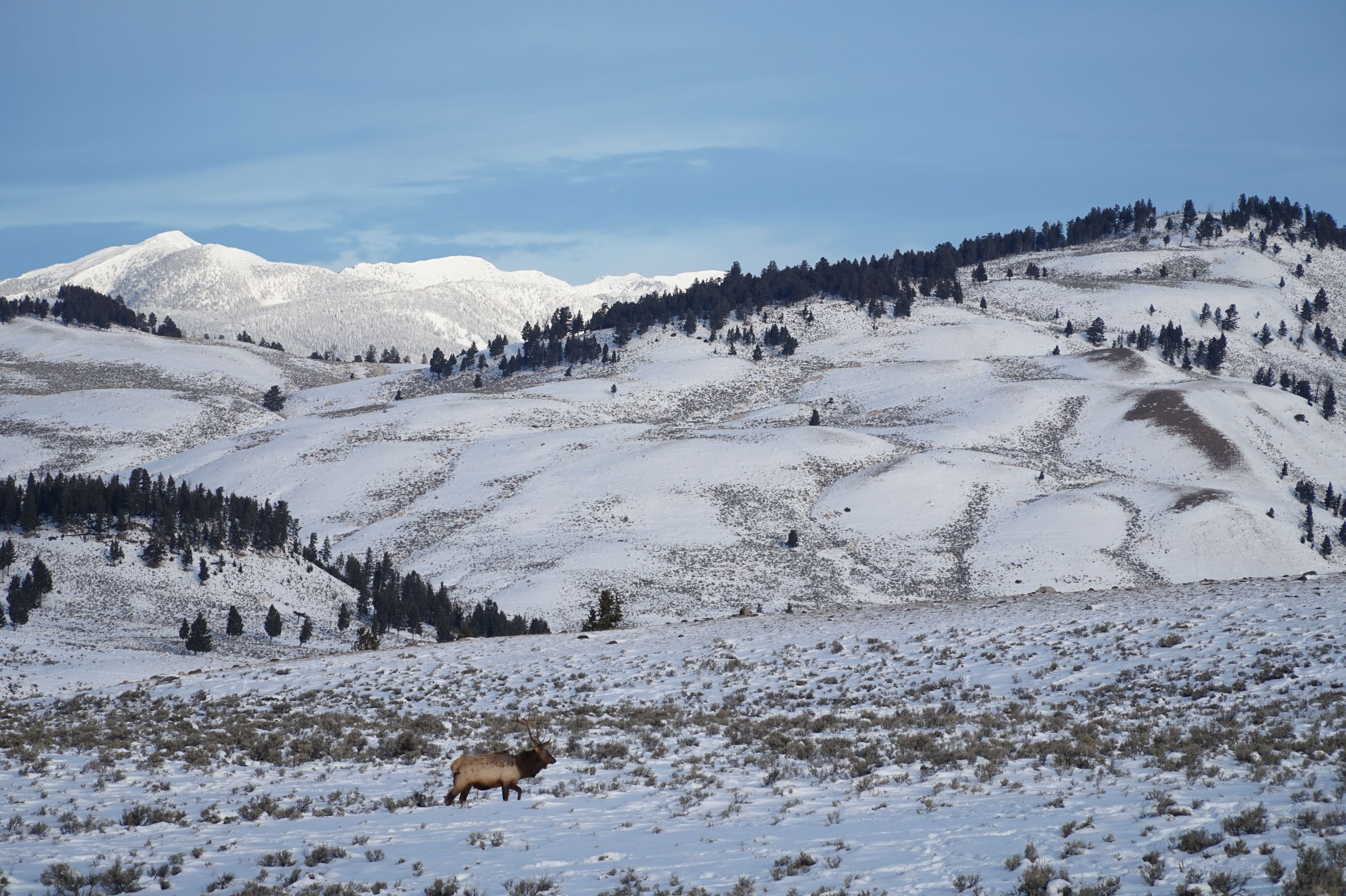 冬のYellowsotne 立派な枝角を持つオスのエルクが雄大な景色をバックに進む