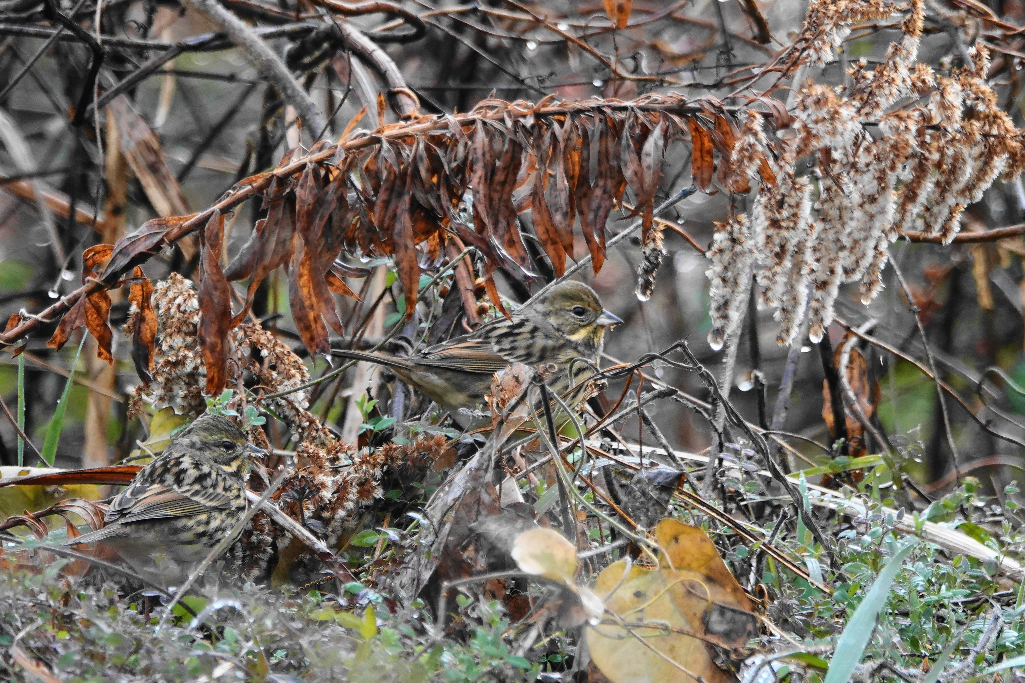 雨上がりで水滴の滴る冷たい茂みの中を 食べ物を求め動き回る#アオジ#達。 とても冷たそうでした。