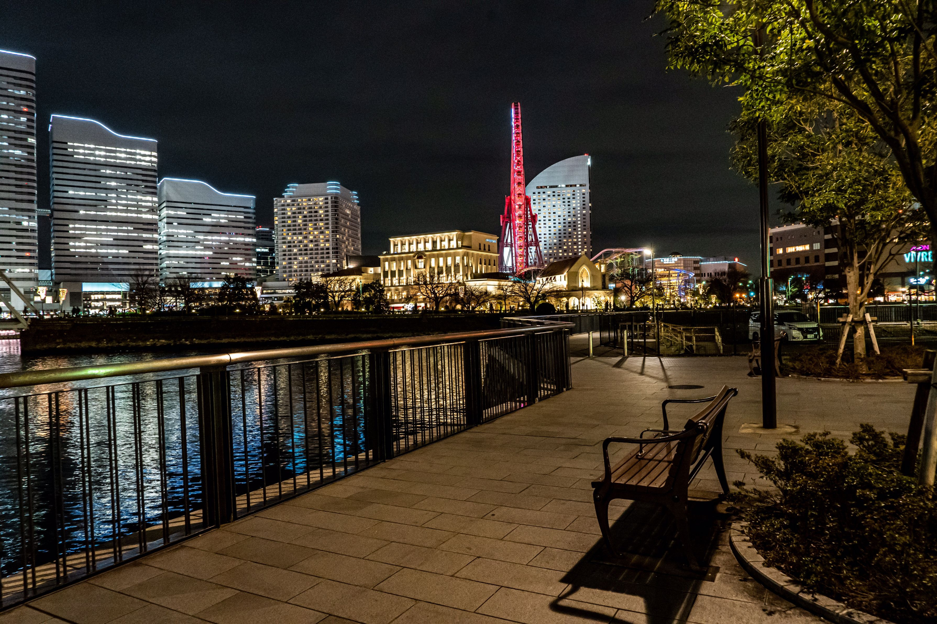 煌びやかな夜景を前にひっそりと佇むベンチ。 すぐそこにたくさんビル群があるのにここは静かだったので それが伝わるような写真を撮ってみました。