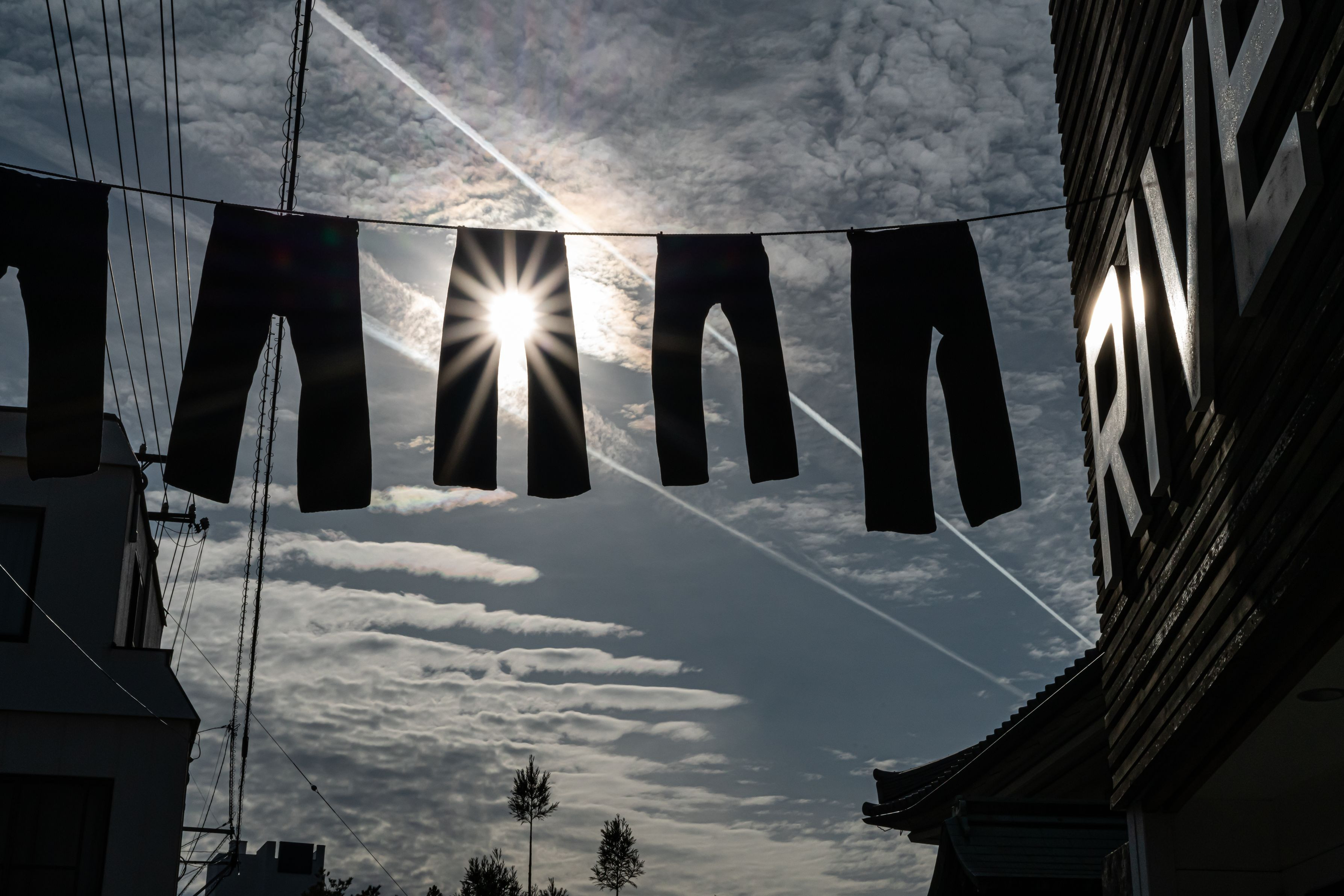 岡山県児島にあるジーンズストリートにてスナップ撮影しました。 二つの飛行機雲が対角線上に伸びていたので思わずシャッターを切りました。