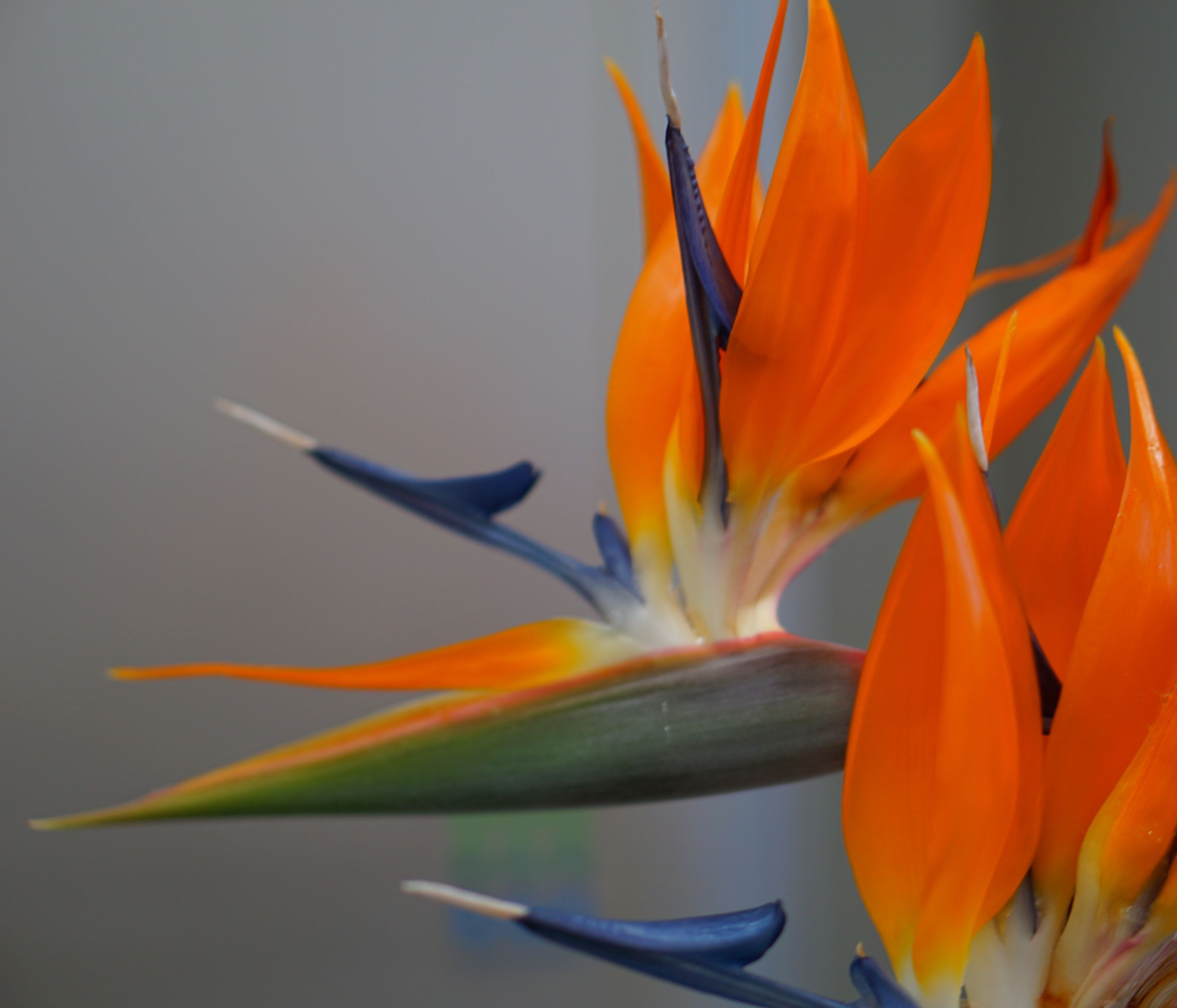 草丈1~2mで、花茎にとがった苞をつけ、そこからオレンジ色と紫色の まるで鳥のような花を咲かせる。エキゾチックな配色と都会的でしゃれたフォルム は、花言葉通り。 花言葉:気どった恋 (近所のお宅にて)