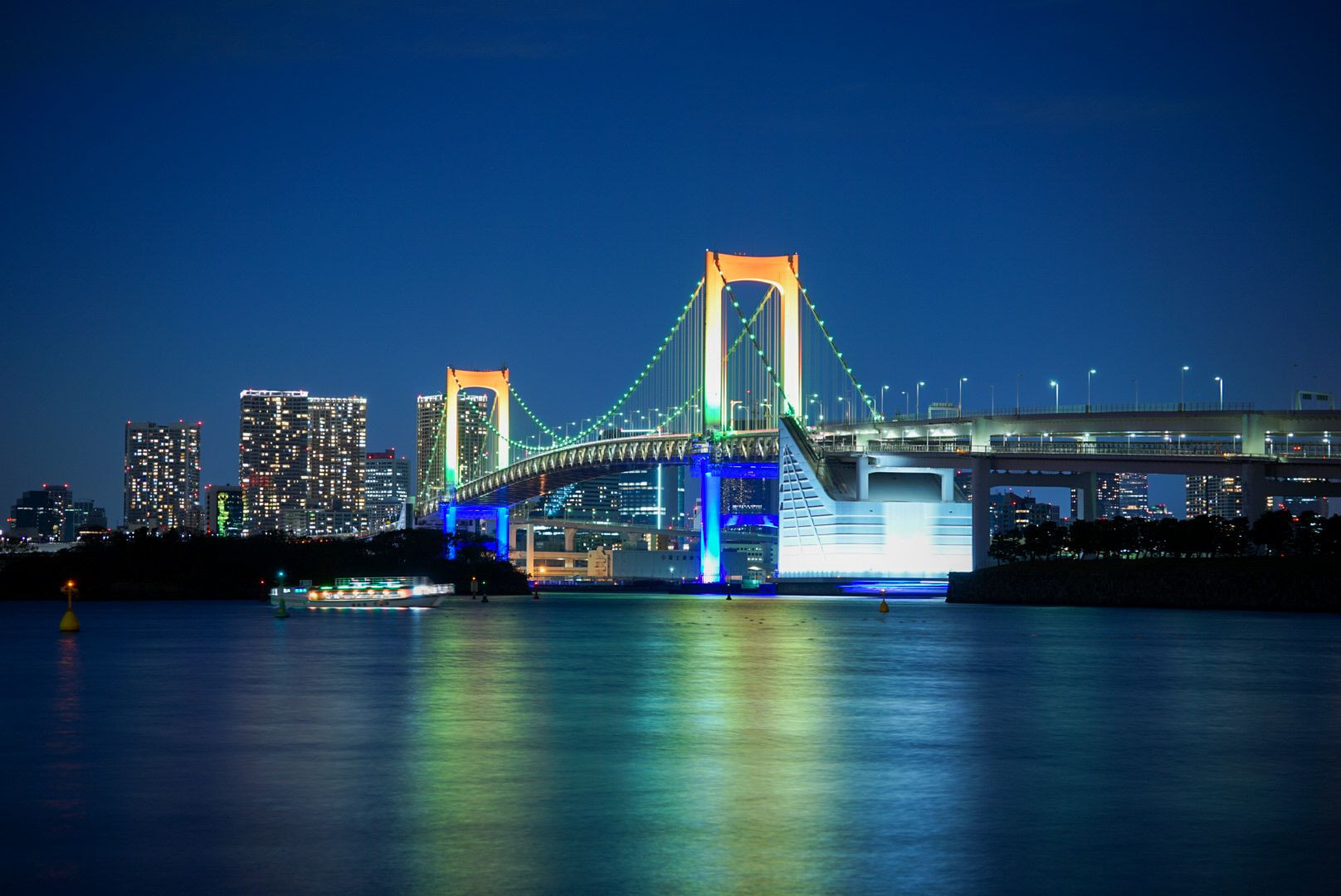 レインボーブリッジの限定ライトアップです。 12月はこのカラーでライトアップされ、水面に反射したカラーもレインボーに。