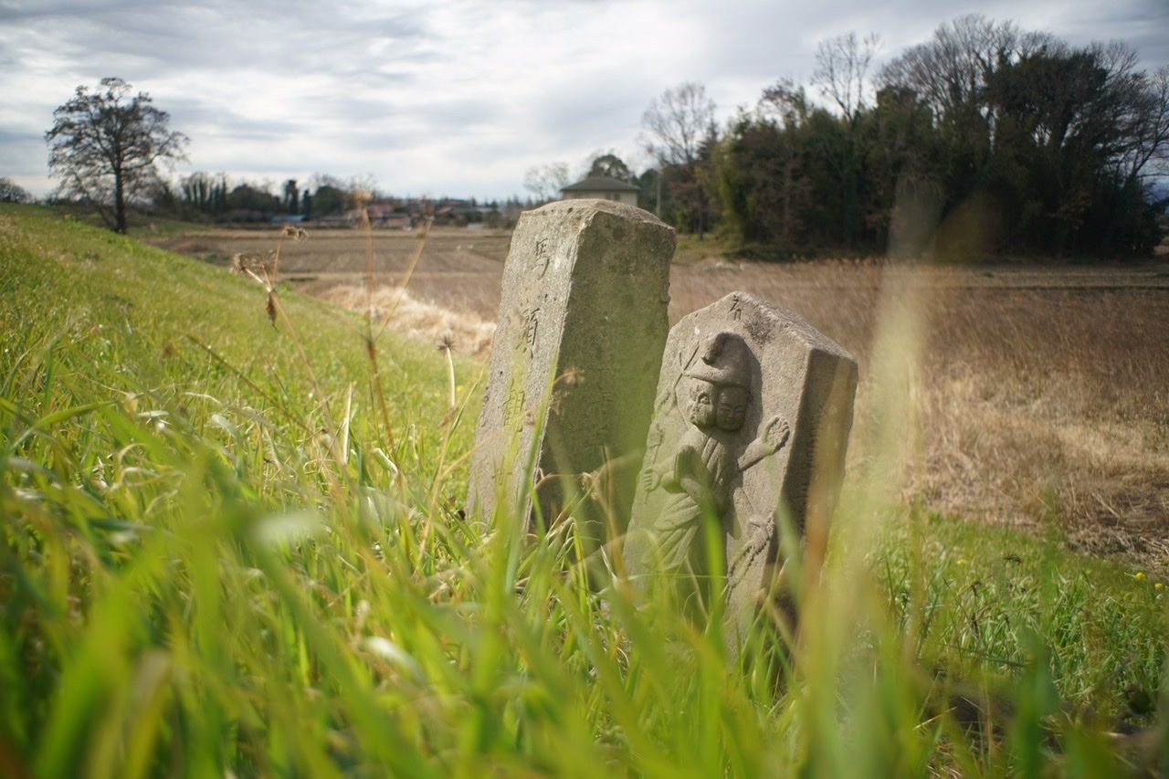 薄雲が広がる荒川サイクリングロードを走っていると、土手の斜面に馬頭観音が立っていた。自転車を降りてカメラを向けると、一瞬、雲が切れてスポットライトのような薄日が射し、馬頭観音を照らし出した。