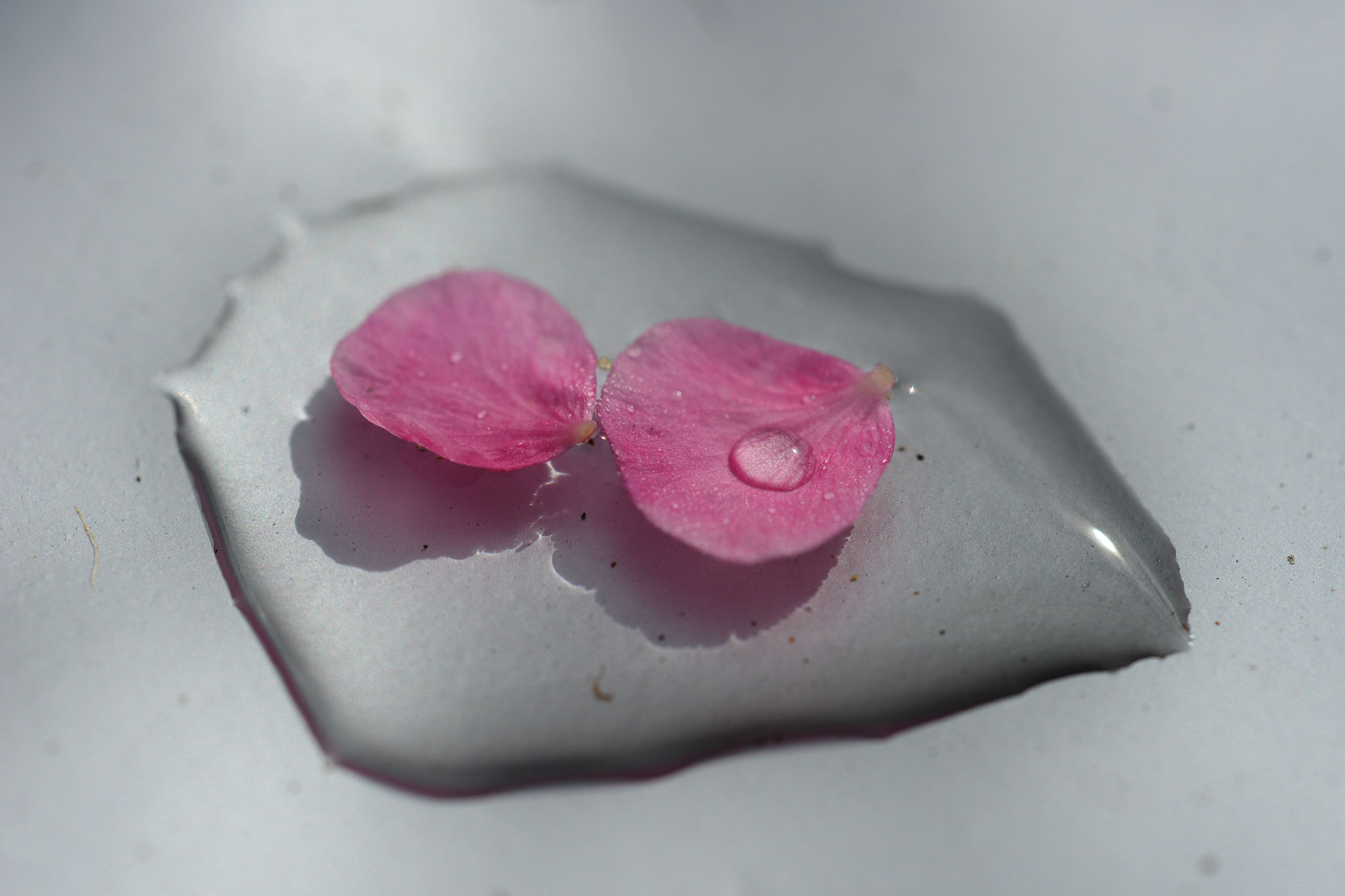 梅園に設置されたシートに残った前日の雨と散ったはなびらです。土埃も多く気になるので露出を明るくしてみました。