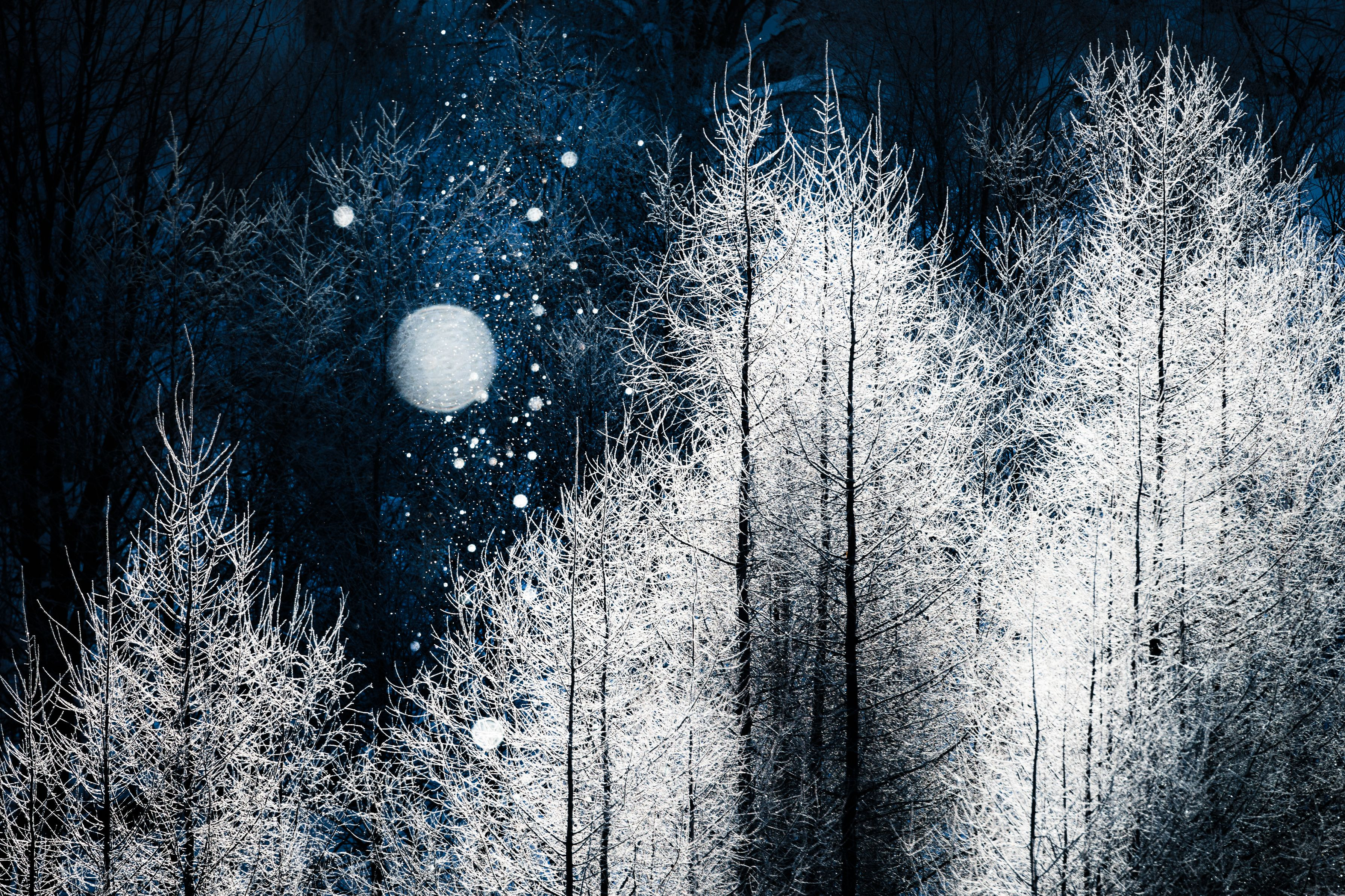 北海道・美瑛町にて。冬の太陽に照らされて輝く霧氷とダイヤモンドダストが美しかったです。