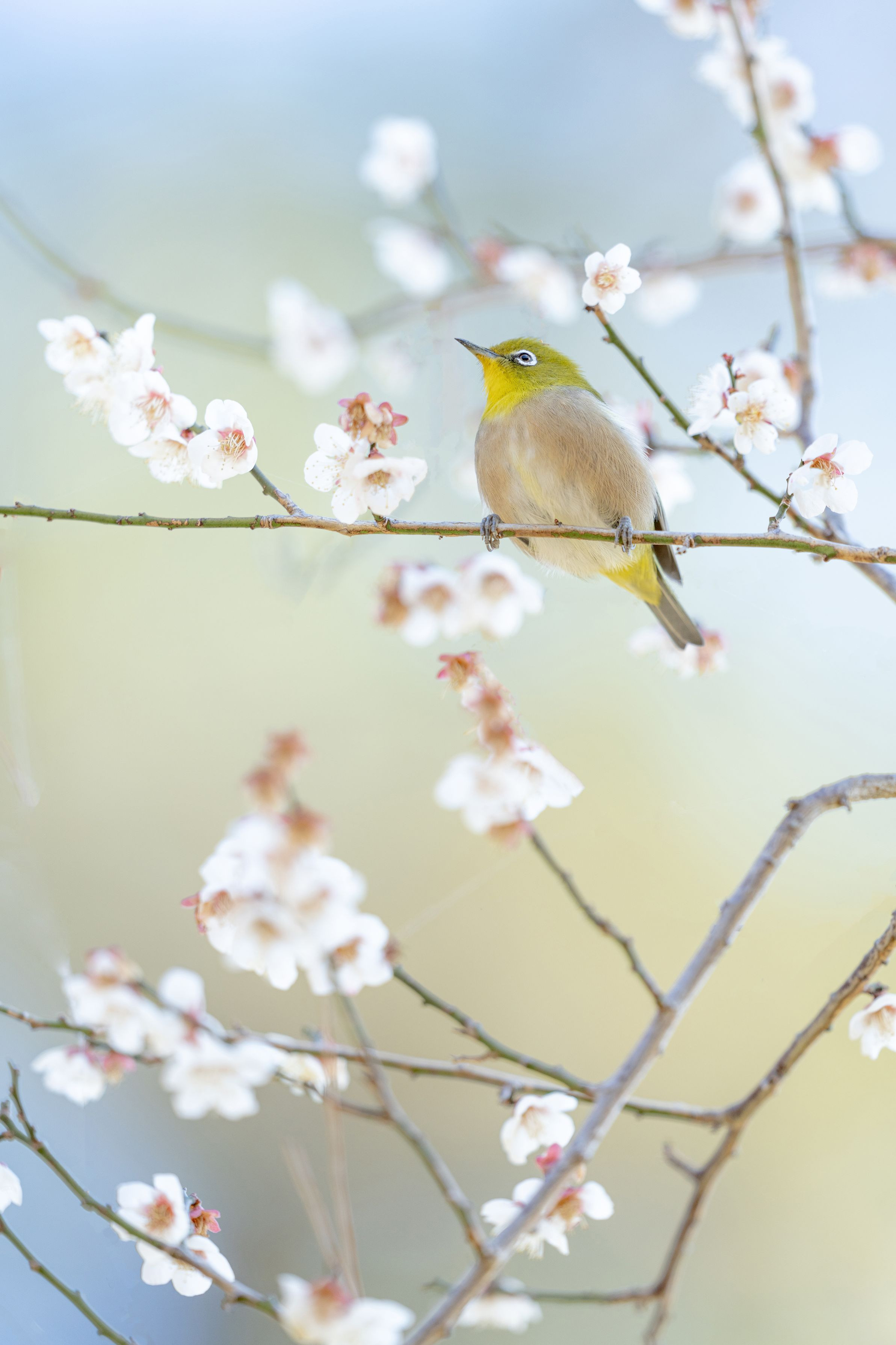 枝が少々うるさいのですが丁度よい背景色にめぐまれました めじろさんとの色合いも気持ち良い春色になりました
