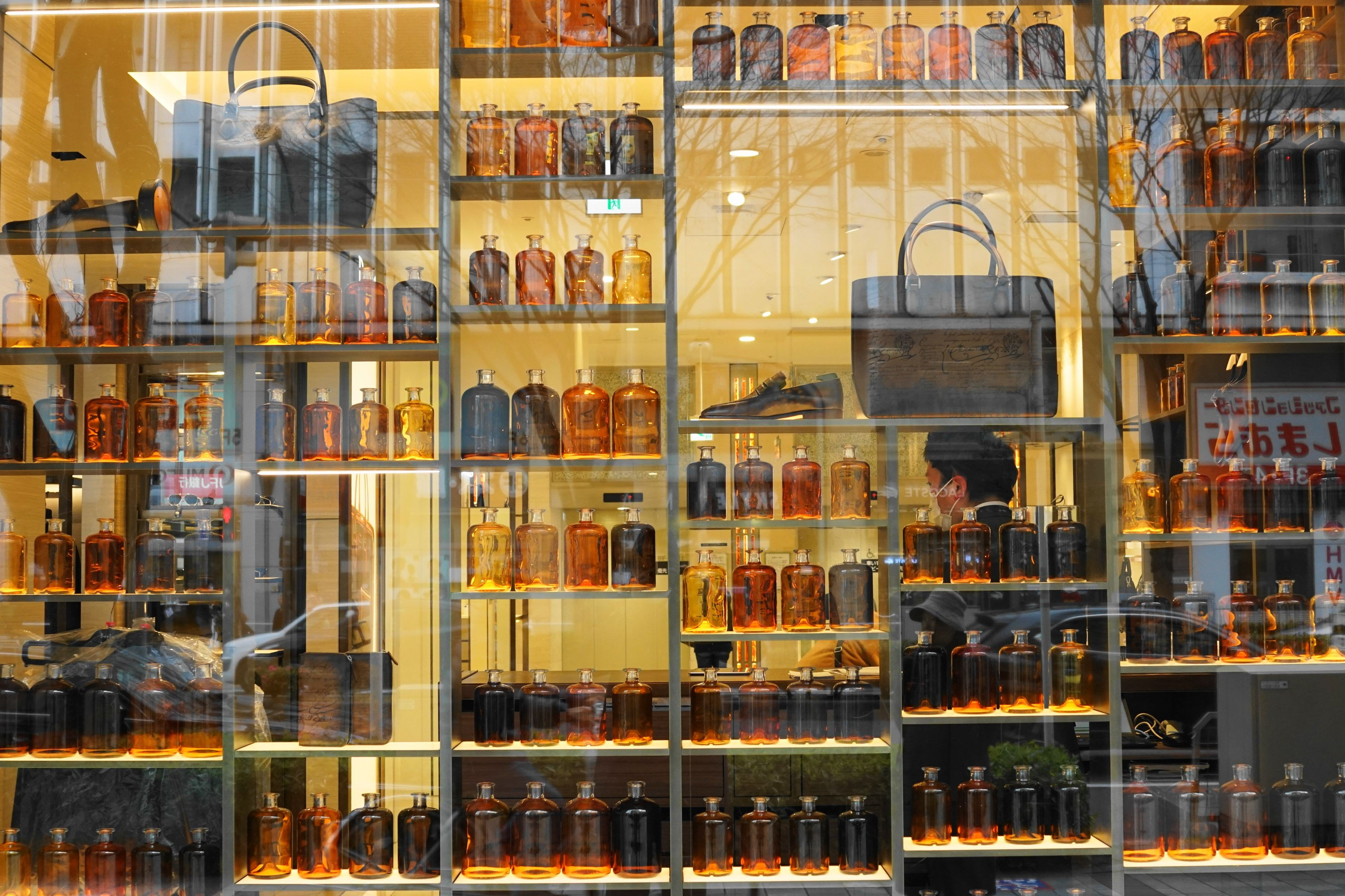 瓶が沢山並んでいますが、この店の商品は紳士用の靴や衣服で、瓶とは全く関係がありません。 名古屋市栄にて
