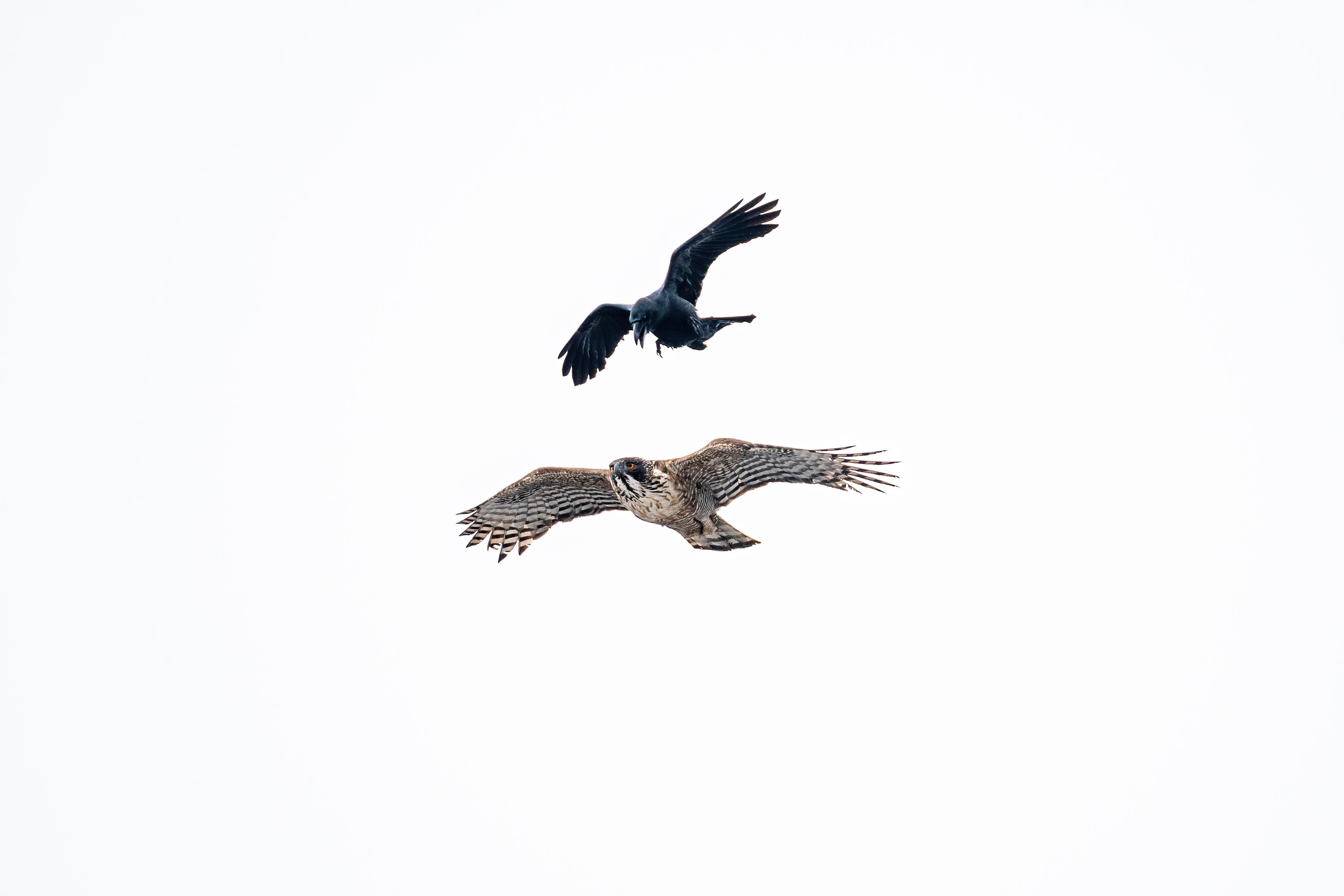 森林生態系の頂点と言われるクマタカですが、それでもカラスはちょっかいをかけてきます。が、ものともせず悠然とやり過ごすクマタカ、年季の入ったものらしく虹彩がオレンジ色なのがわかります。背景が入らず、曇りの空抜けとなったのが残念な絵です。