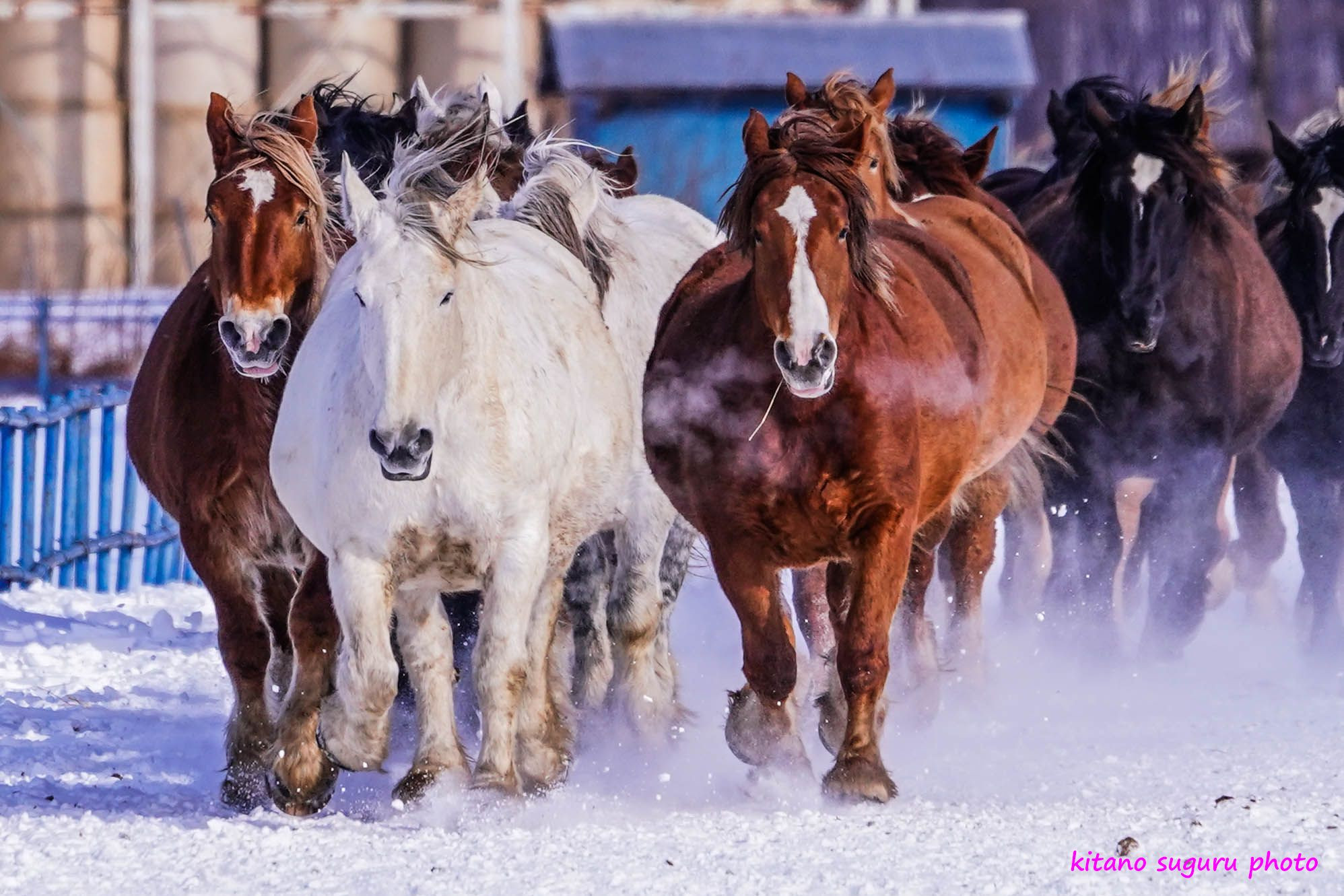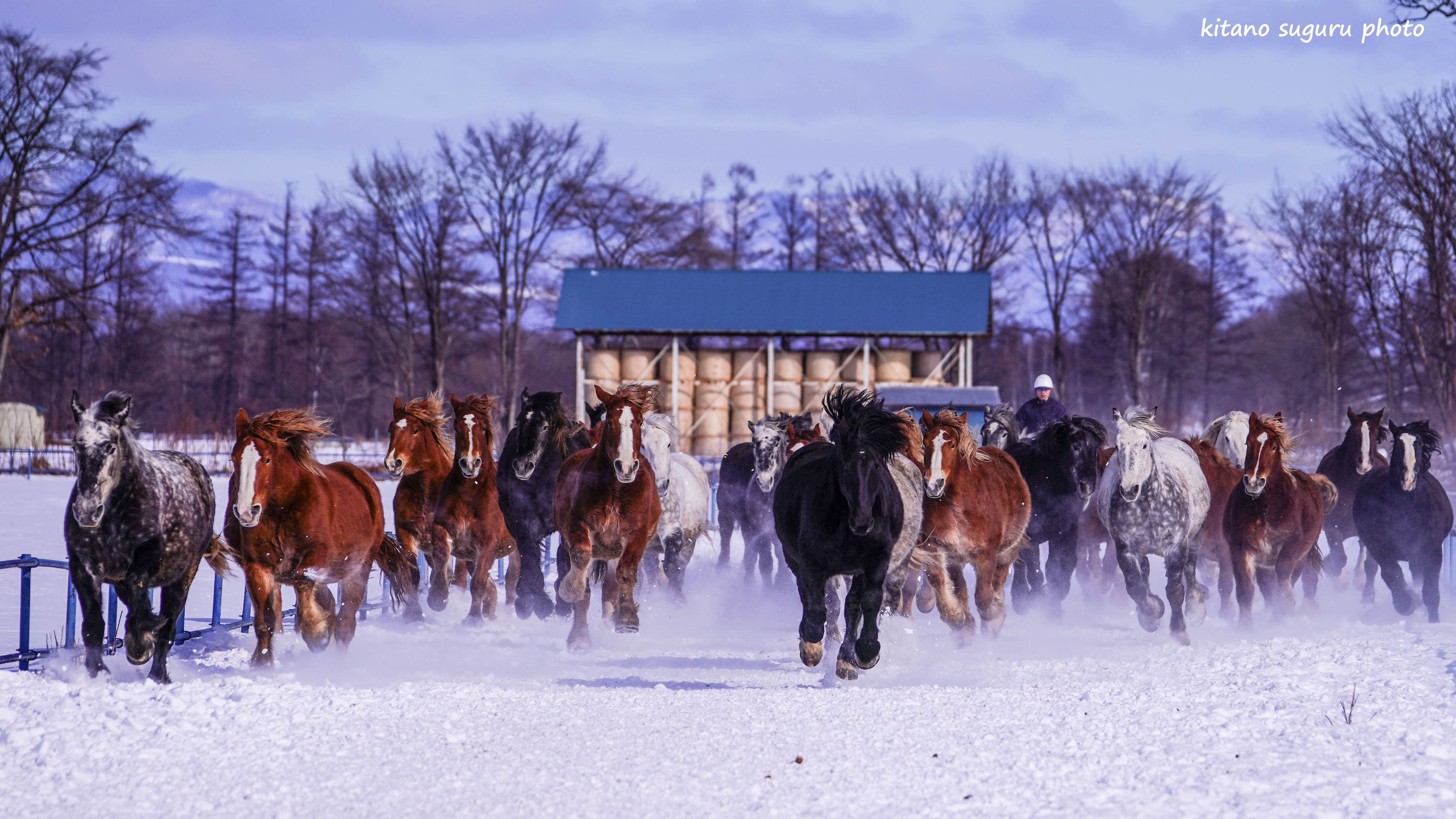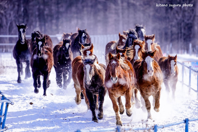 今回初めての体験でした。カメラマンの多さにビックリでした。 早めに行ったので最前列に陣取りして臨みました。 1mぐらいのところを馬が走るので、走る音・馬の吐く息が聞こえてきて迫力満点でした。 馬追いをするのは妊婦の馬が冬の期間中に運動不足解消のための馬追いだそうです。