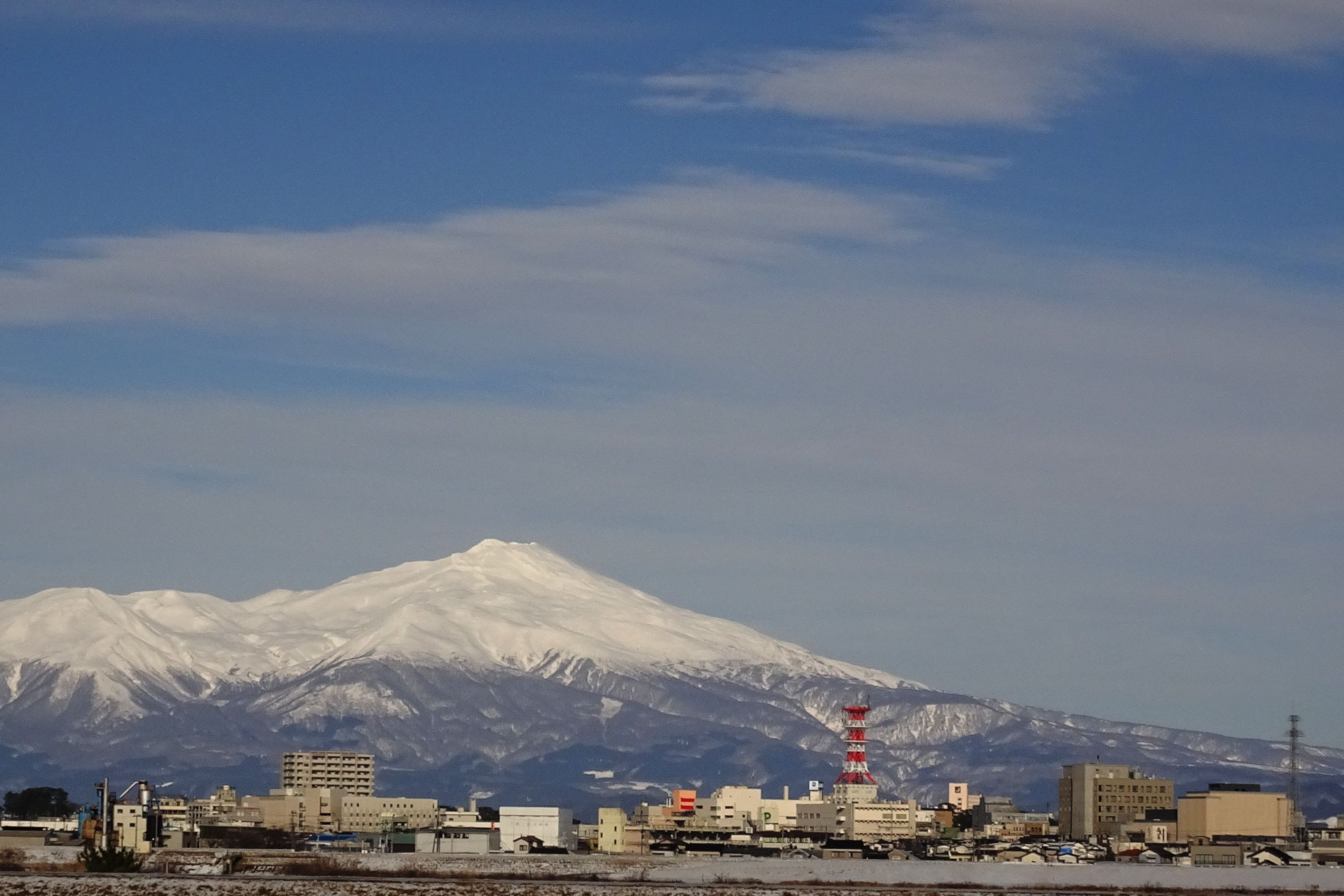 酒田市の街並みから鳥海山を望む冬 右下のビルは市民会館の希望ホールとその左隣は市役所です。希望ホールの名は当市出身の岸洋子さんの歌からです。(^-^)