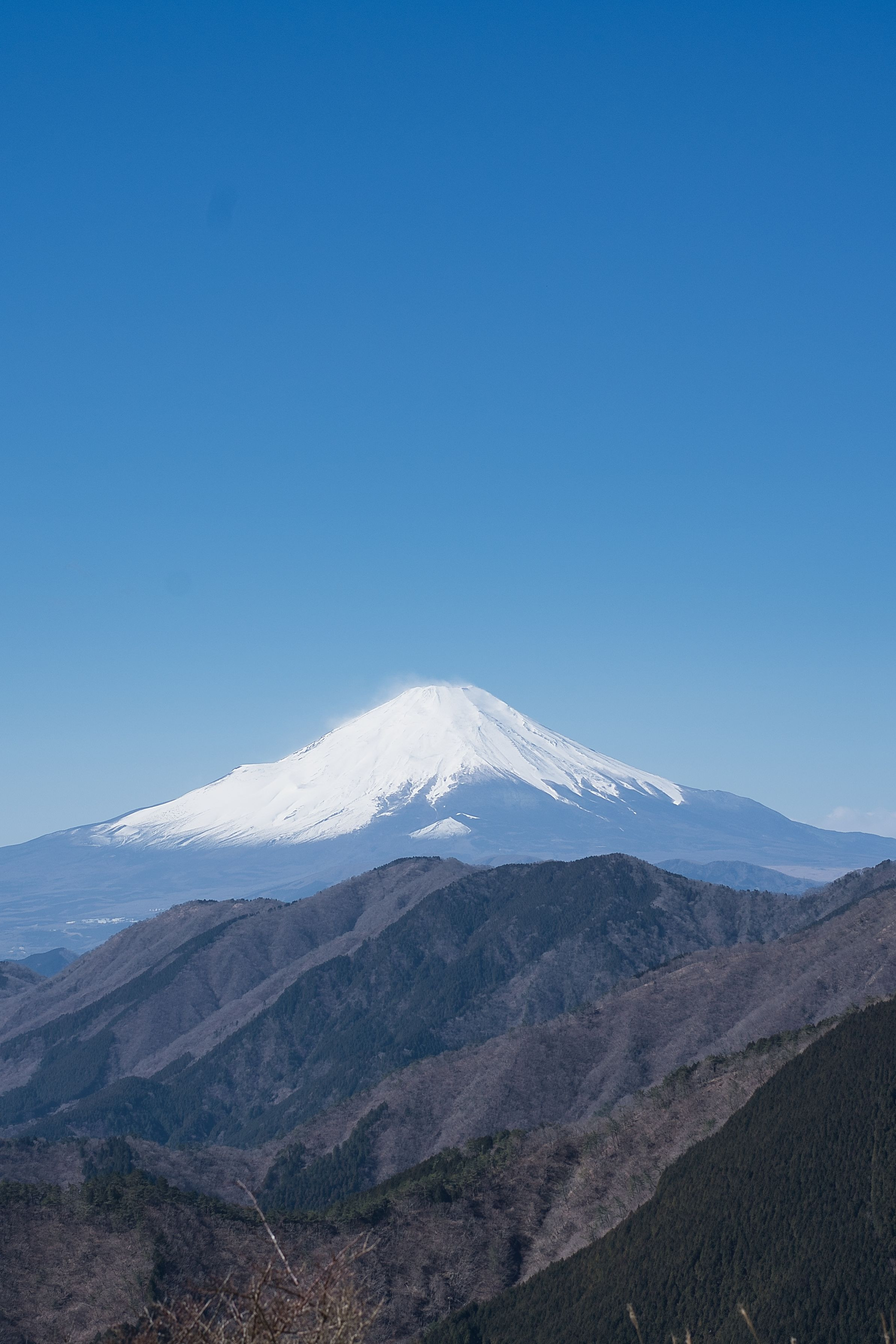 快晴の日、丹沢に登った時に見えた富士山。風が強く、山頂の雪が吹き飛ばされたいるのが見えました。ちょっとべたな感じになりました。