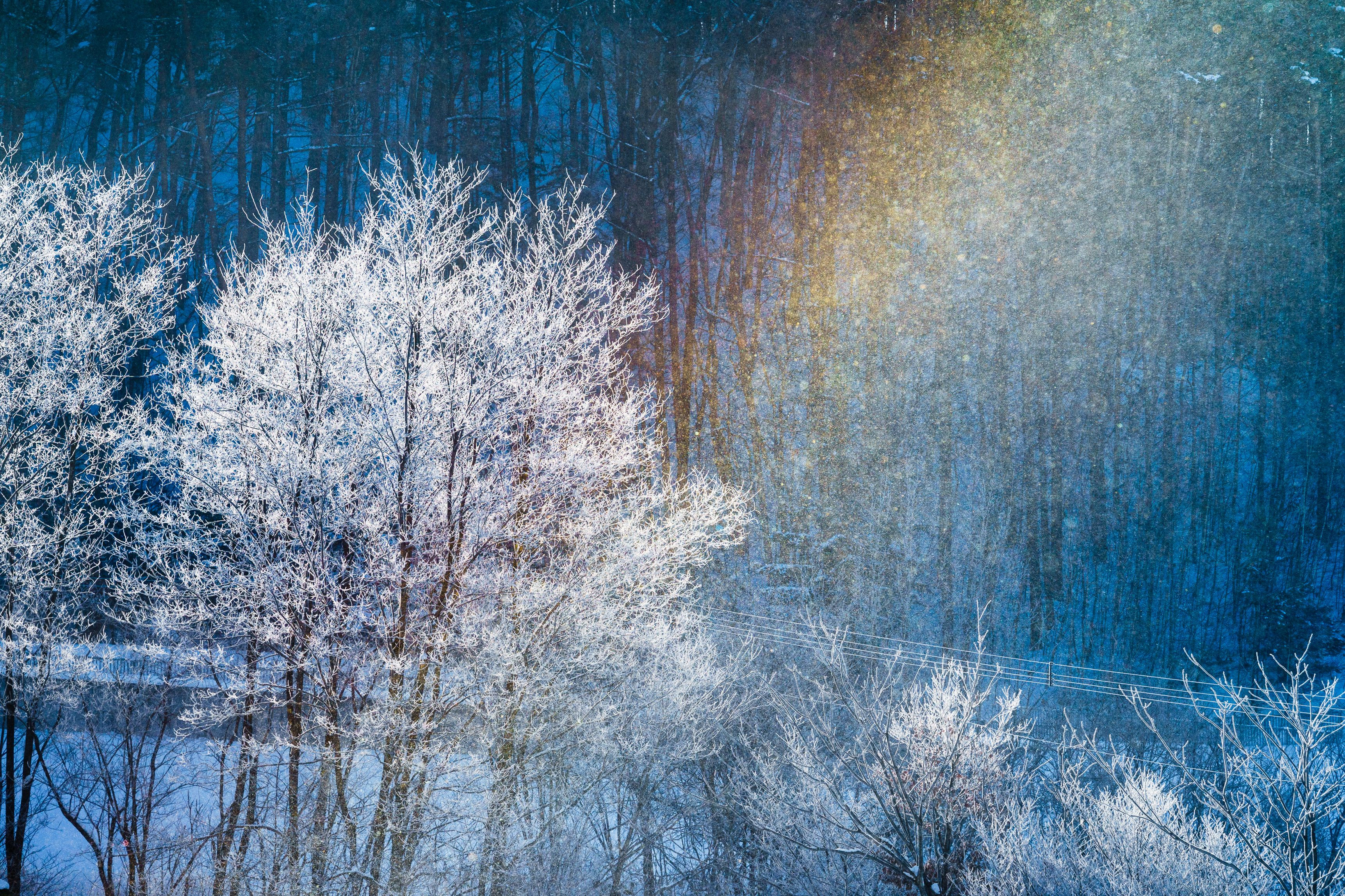 北海道・美瑛町にて。一面に舞うダイヤモンドダストに虹がかかりました。初めて見る光景に心が踊りました。