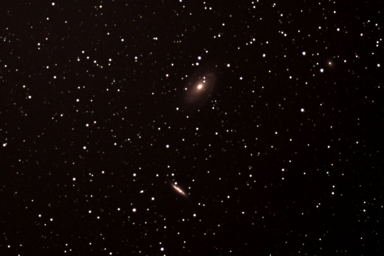 今回の写真は、綺麗に...プロが撮る写真みたいに...とか関係なく、僕の愛機7M3のカメラに70200㎜GMレンズ、簡易赤道儀使って、光の速さでも1200万年もの距離にある天体、おおぐま座方向のM81、M82銀河を「ある程度」の形(渦巻銀河とわかる)で写せたことに自己満足する1枚★ NASAの写真とかと比べたらダメだぞっ(笑) 焦点距離は200㎜でAPS-Cモード→実質300㎜♪ これで十分♪