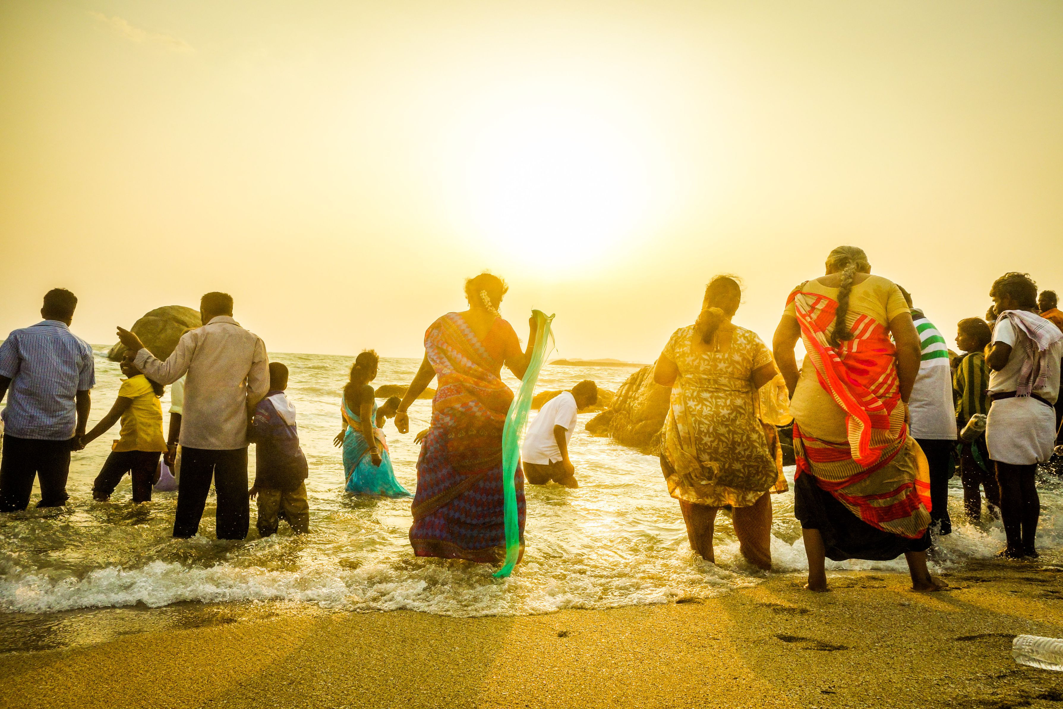 インド最南端にある聖地にて。 アラビア海に沈む夕日、色とりどりの服、聖地なのに海水浴のようにはしゃぐ人々、何もかもが美しかったです。