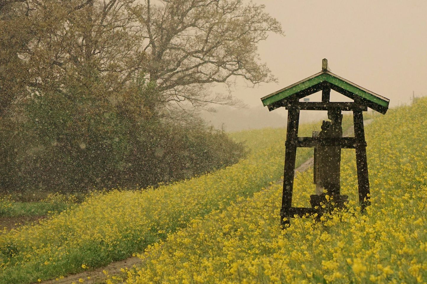 埼玉県の川島町にある角泉のお地蔵様。昔、ここは渡し舟の乗り場があり水難事故に遭った人の供養のために建立されました。菜の花が咲き揃ったところに雪が降りました。お地蔵様もビックリですね。