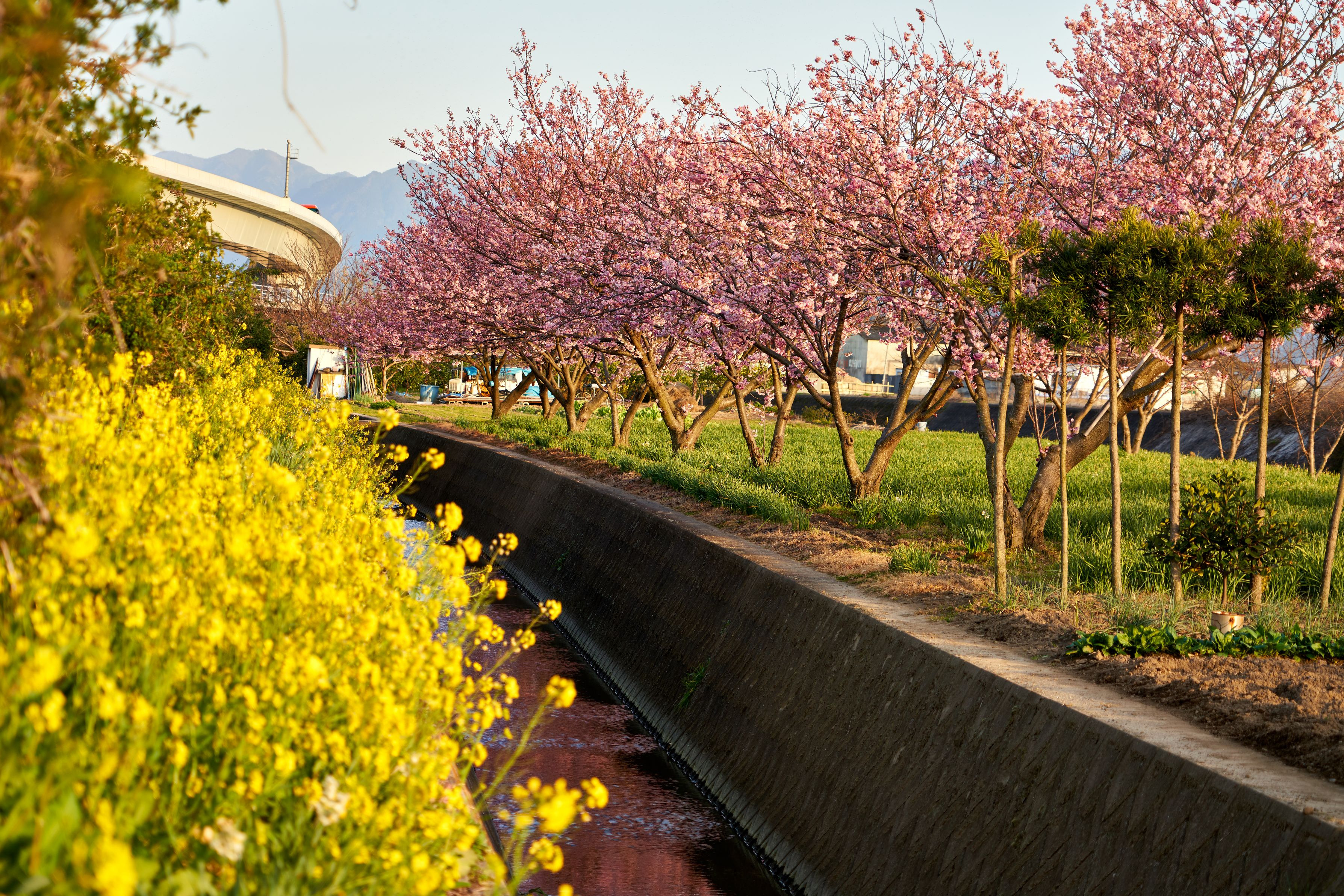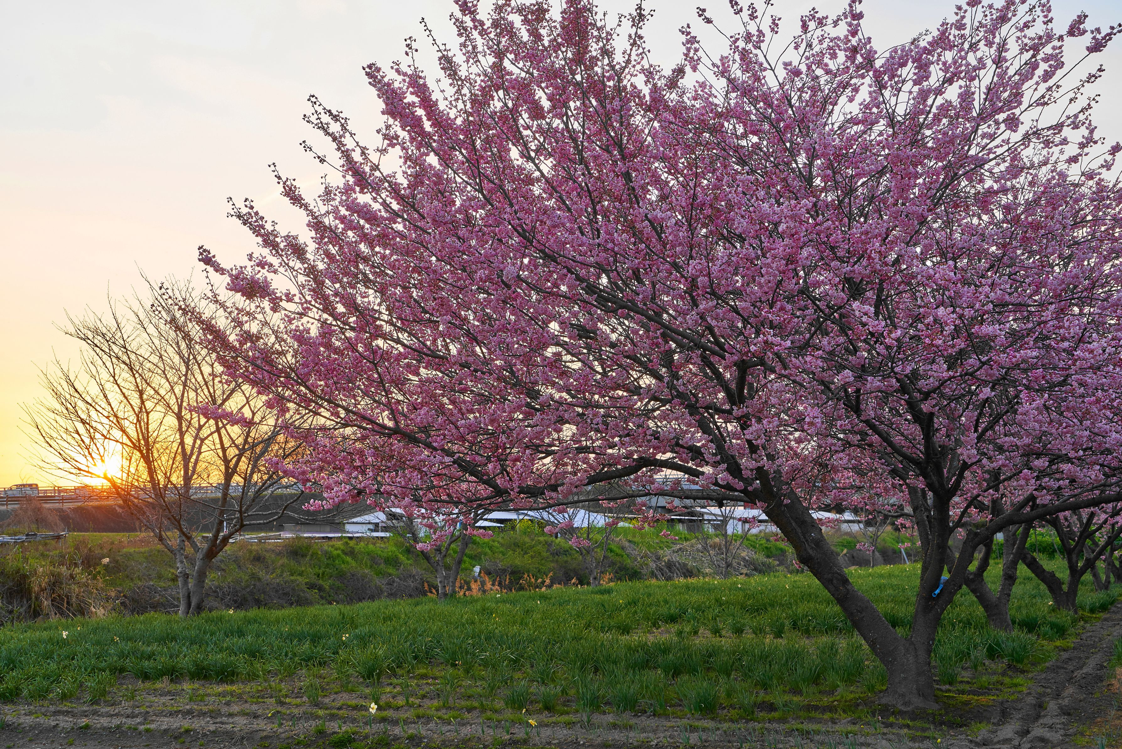 郊外の畑の土手沿いに植えられた寒桜(と思います)が夕焼けに輝いてました。