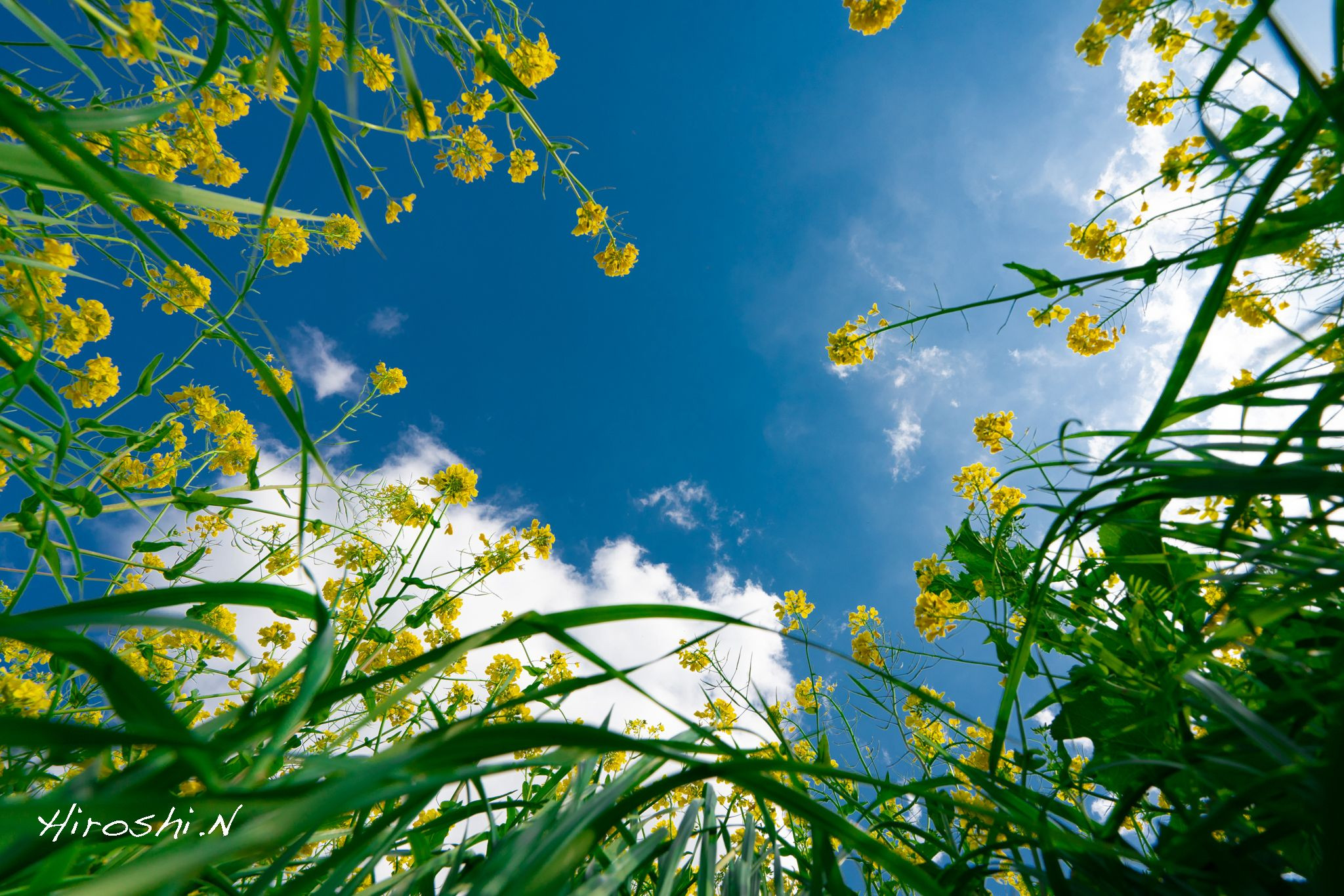 福岡県遠賀川沿いの菜の花です。マニュアルフォーカスであらかじめピントを設定して、地面に置いてセルフタイマーで撮影しました。