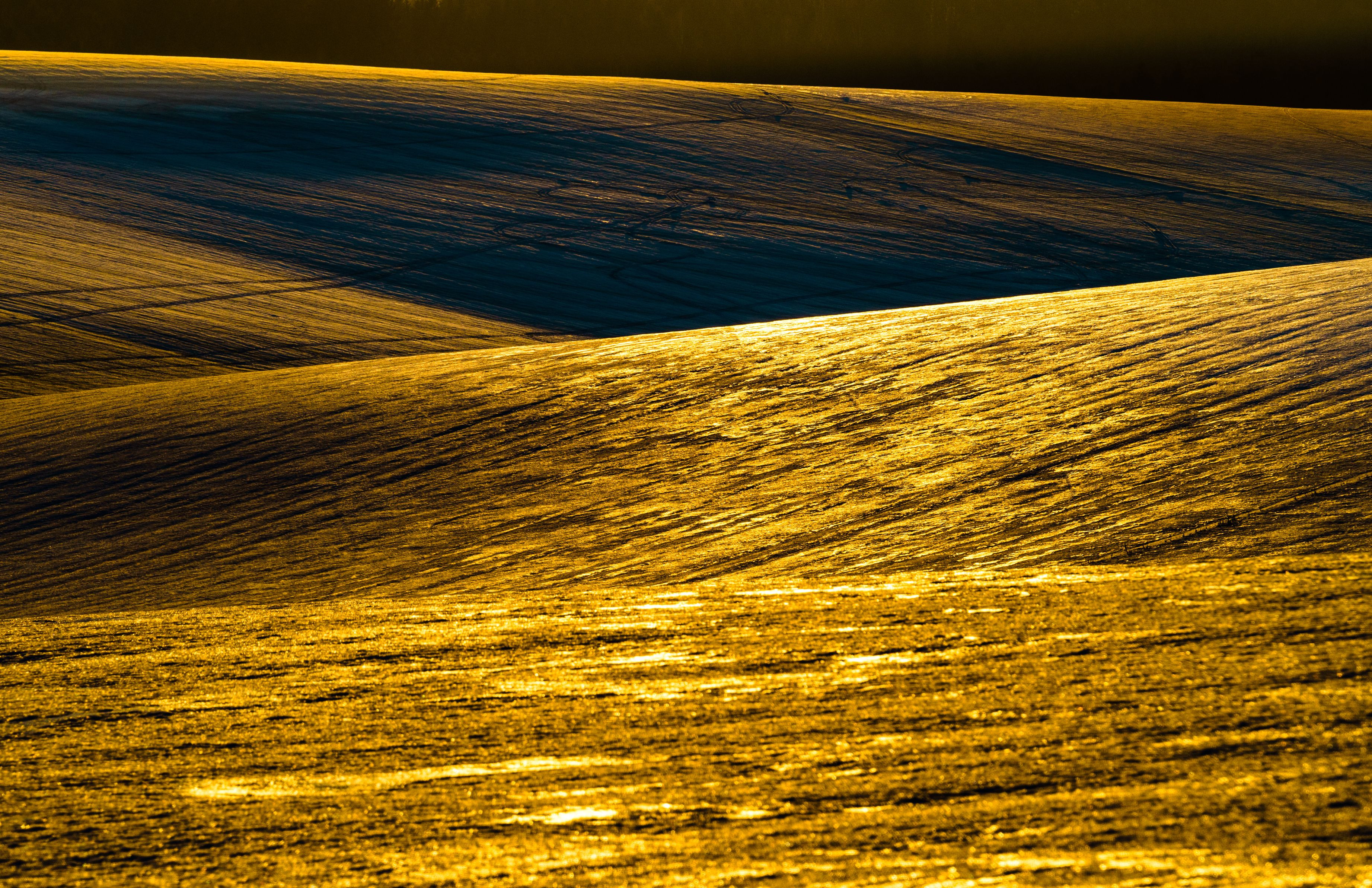 北海道・美瑛町にて。ザラメ状になった雪原が夕日に照らされて金色に輝いていました。