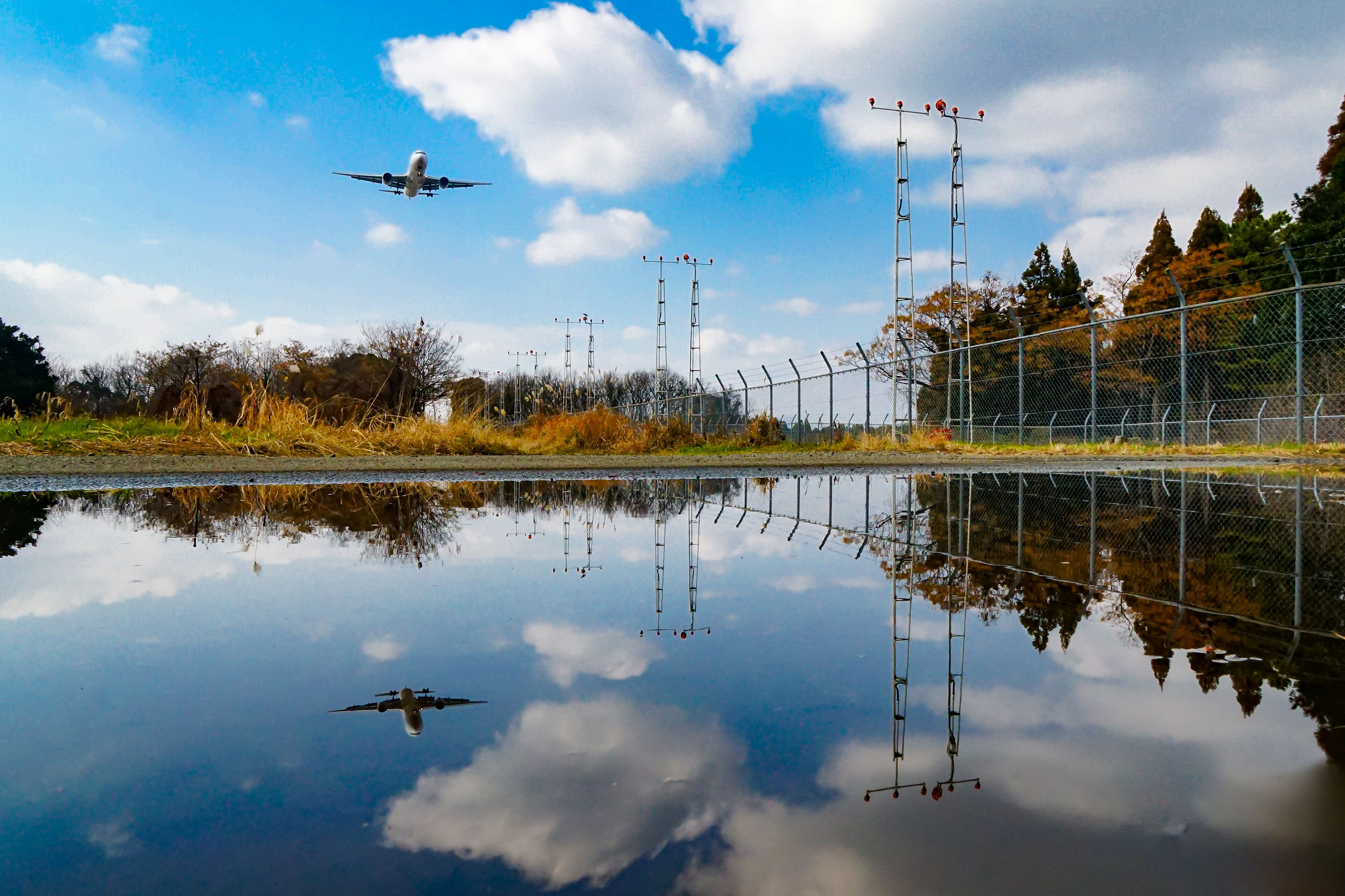 最近は水溜りが人気だ 風がなく、これくらい穏やかな水面だと撮りやすい 進入灯と雲を見ながら構図を整えて待ち受ける 水溜りスレスレまでカメラを下ろしバリアングルモニターで撮影
