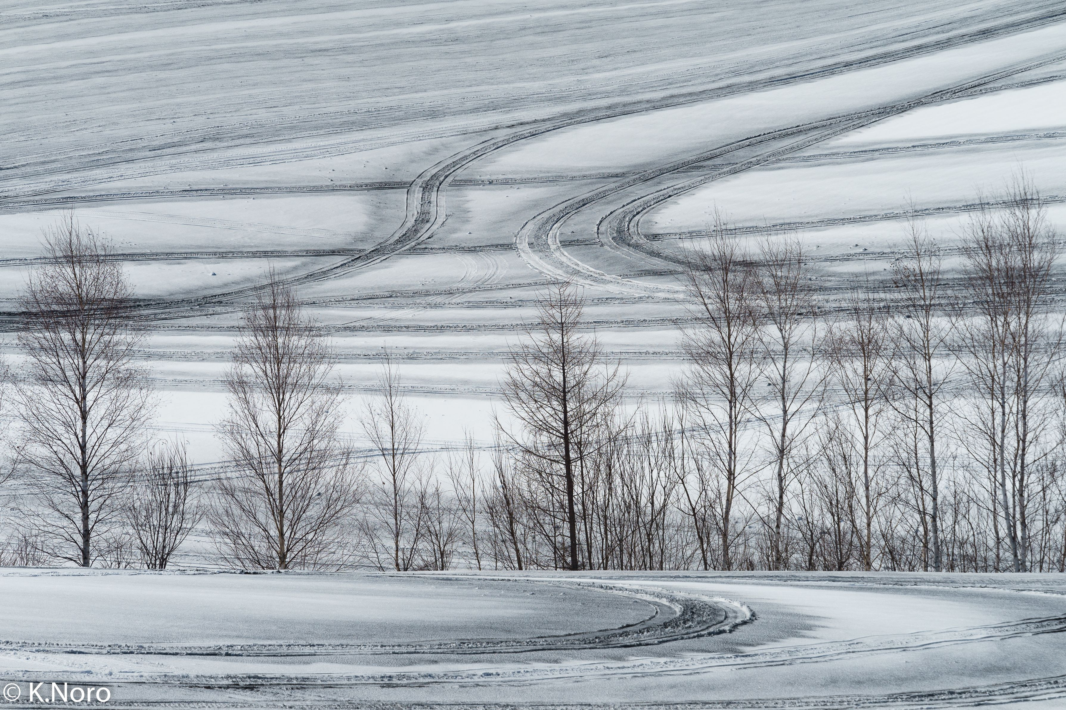 北海道・美瑛町にて。晩冬の丘に融雪剤の幾何学模様が描かれていました。