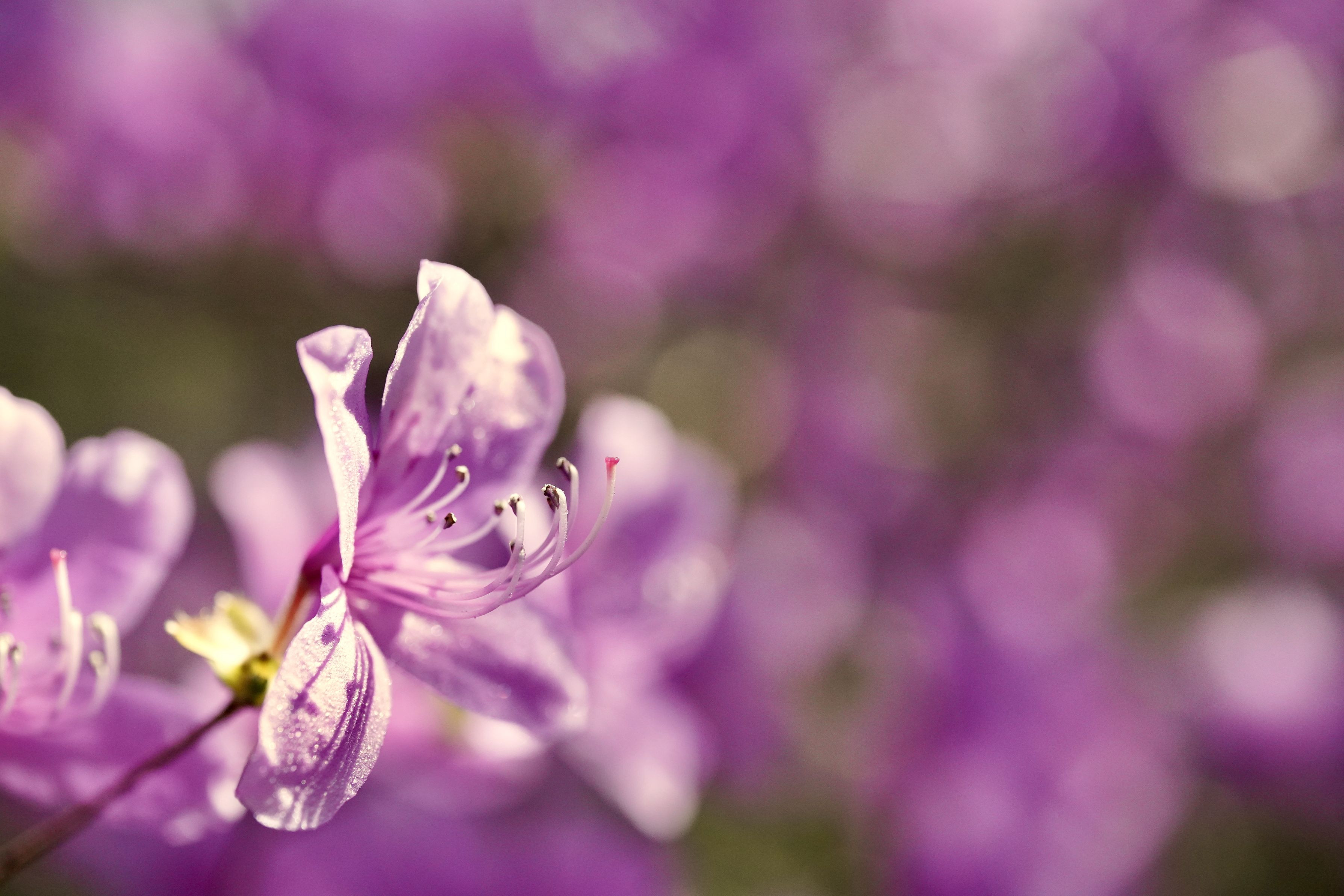 薄紫色のたくさんの花が朝日に映えてます。春だね〜