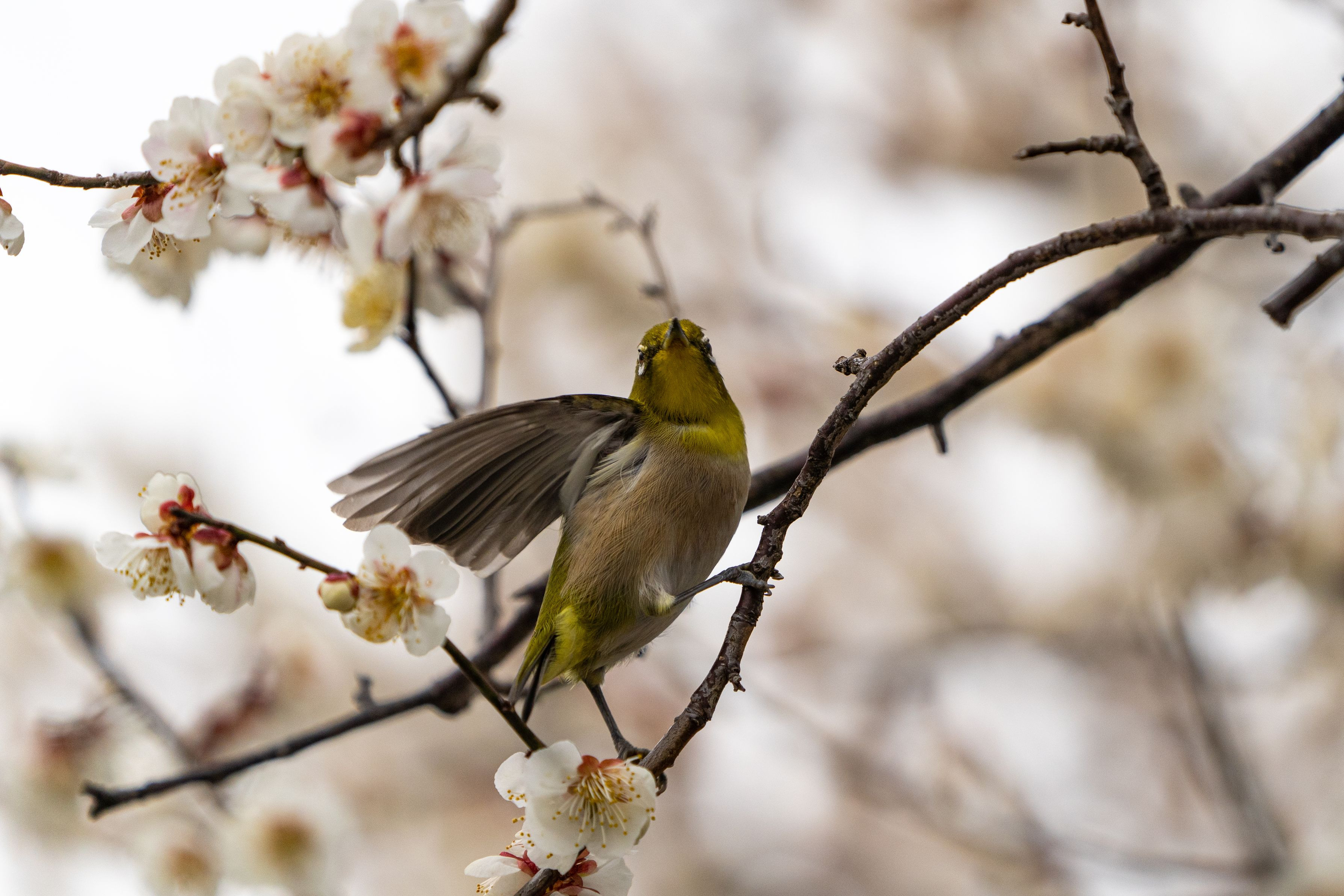先月ですが、梅宮神社での写真です。 変わったポーズのメジロが撮れました。