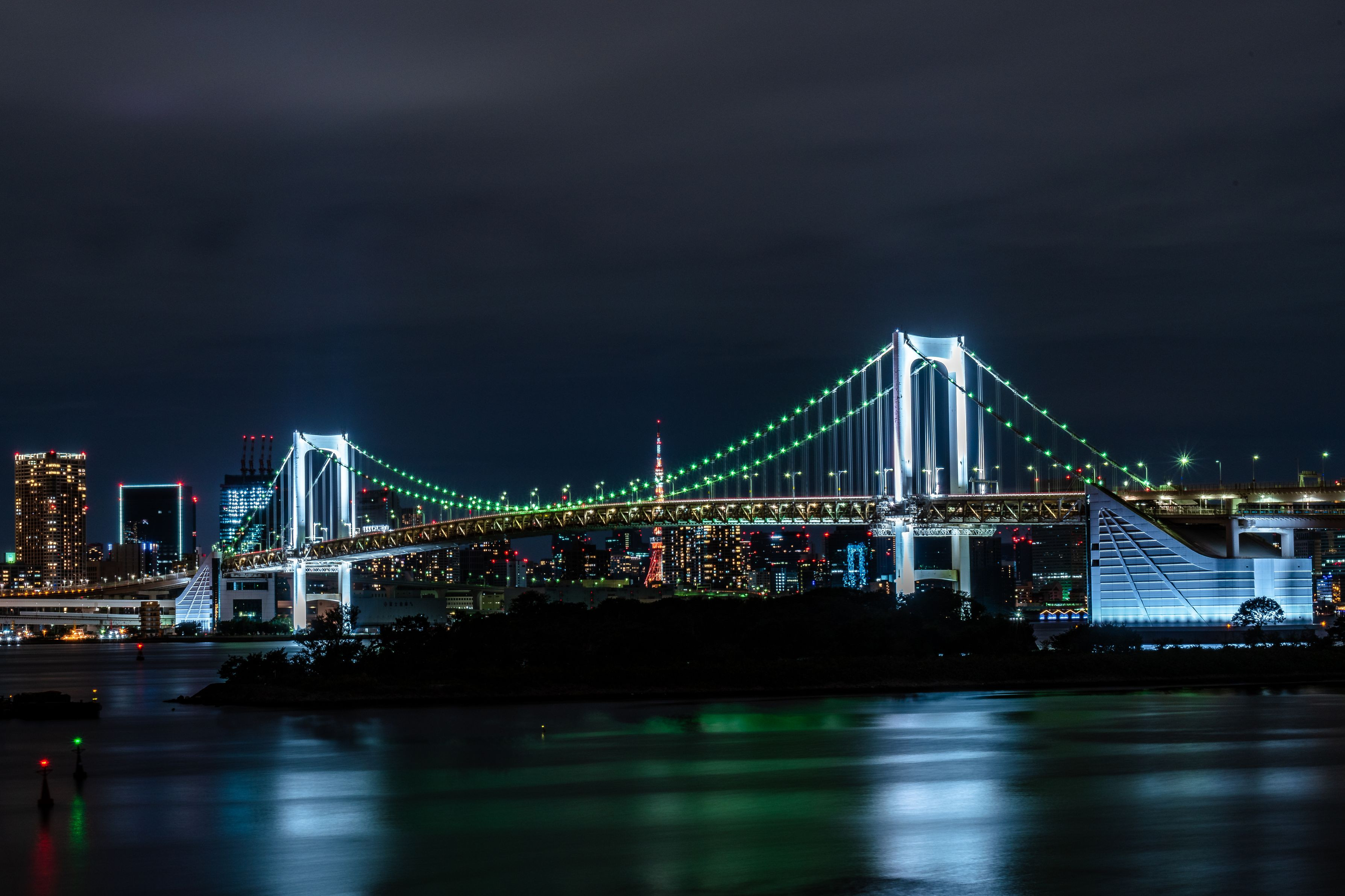 お台場海浜公園から撮影した東京タワーとレインボーブリッジです。